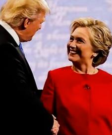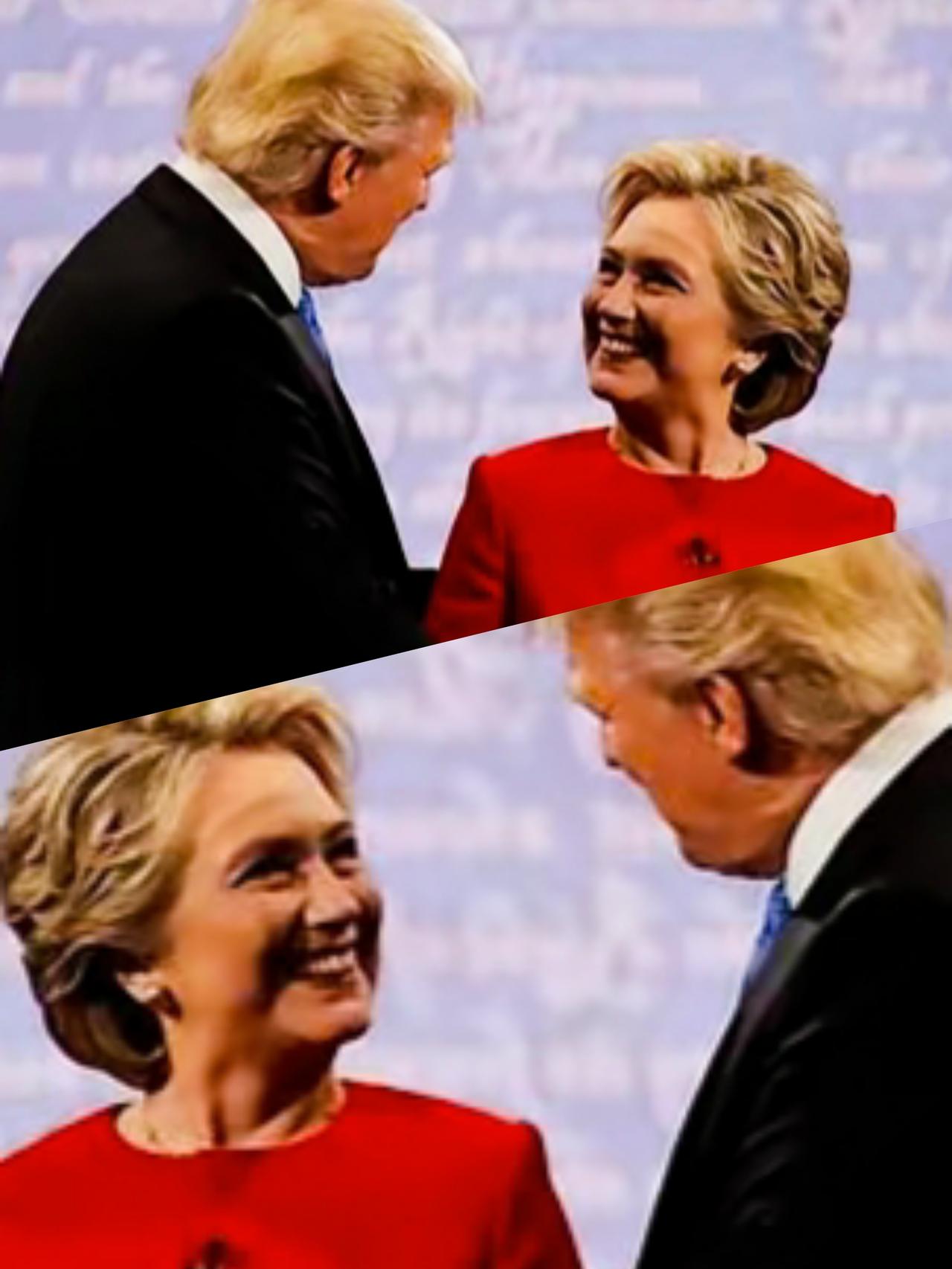 希拉里和特朗普两人在聊什么事情呢? 希拉里满脸笑容,这么开心啊! 特朗普握着希拉里的手,有没有施展大力握手绝活呢? 面对希拉里的笑容,特朗普此时会是什么样的表情呢?会是什么样的心情呢?