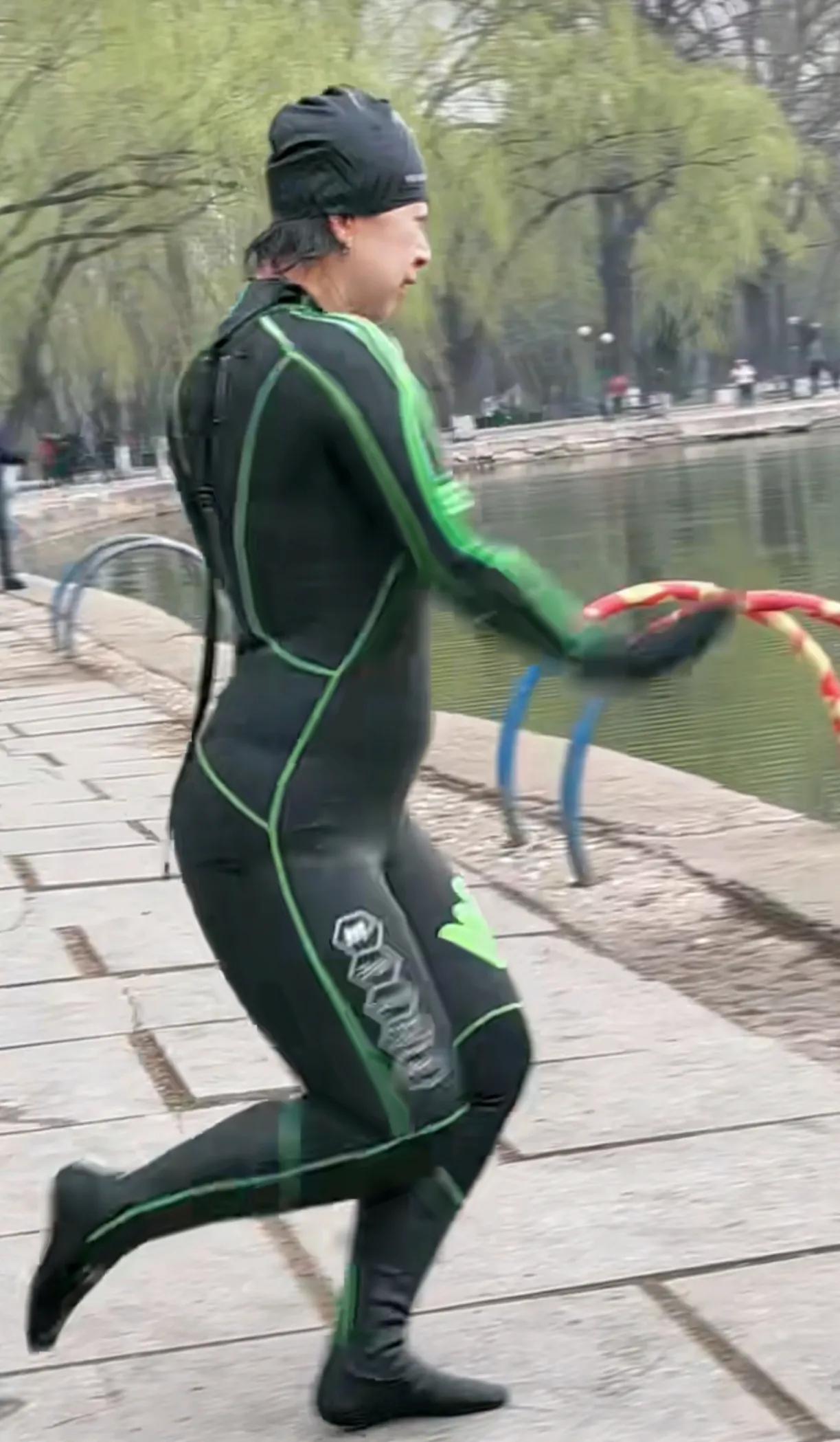 大姐这身打扮干净利落,显得身材妖娆多姿,游泳前来段走秀。