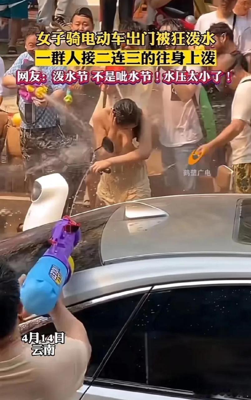 泼水节 性骚扰今年泼水节的乱象真的让人很气愤,简直就是给某些人提供了一个合法骚扰别人的机会。好好的传统节日,本是温柔送祝福,现在却变成了部分人肆意发泄的借口。拿着高压水枪追着女性猛喷,专挑敏感部位,拒绝也没用,甚至撕扯衣物、泼不明液体,还有人强行拉车门灌水,伤及老人和财物。这种打着民俗旗号的恶意行为,早就变味了,赤裸裸的冒犯与伤害,必须严肃整治!