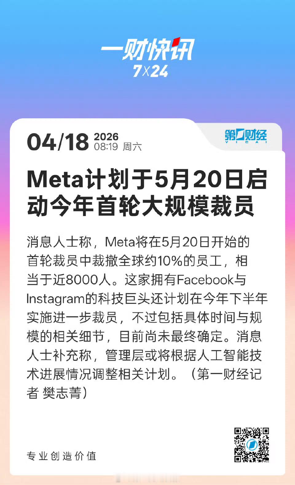 Meta拟于5月20日启动大裁员 搞AI这帮人,智商绝对在社平之上。把生成式AI和智能体搞出来了,大量重复性、辅助性岗位被AI替代。公司反过来精简人力成本,又用省下来的钱换成资源集中投入到AI研发上。这逻辑链条太讽刺了。