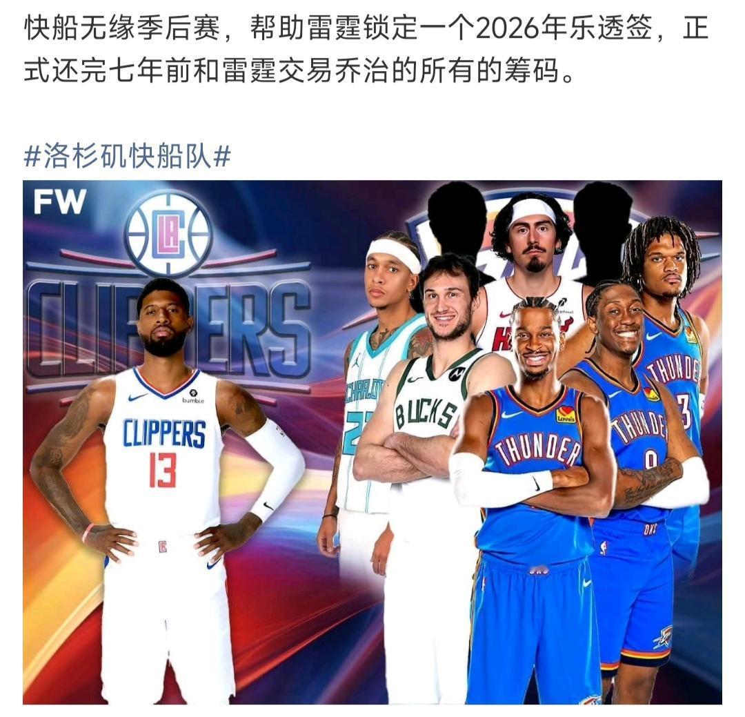快船队真是大善人,为了得到保罗乔治复出那么多,今年选秀又可以在乐透区选好新秀了。 特别是送出联盟第一人亚历山大,送给雷霆一个王朝!! 快船有没有后悔呀,伦纳德+保罗乔治真没用。[捂脸]