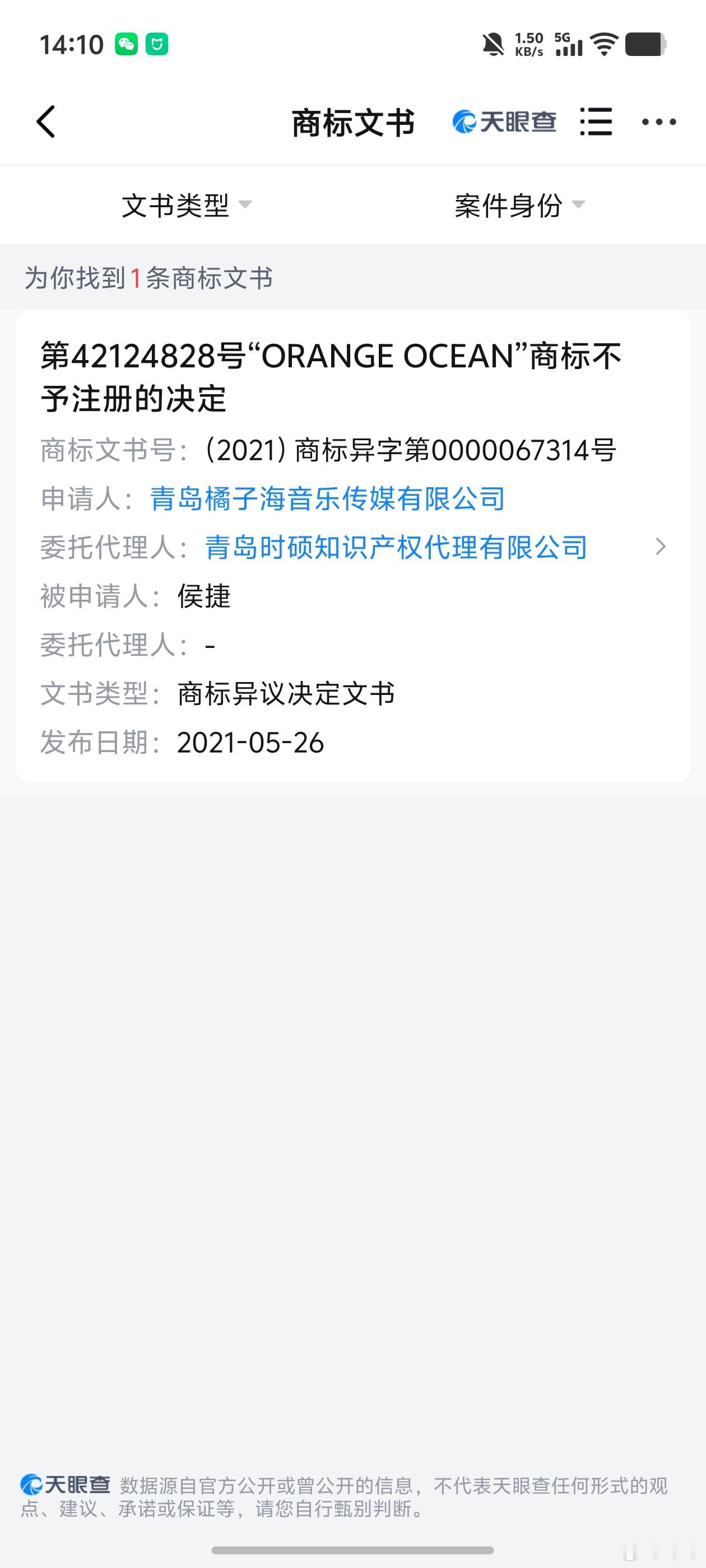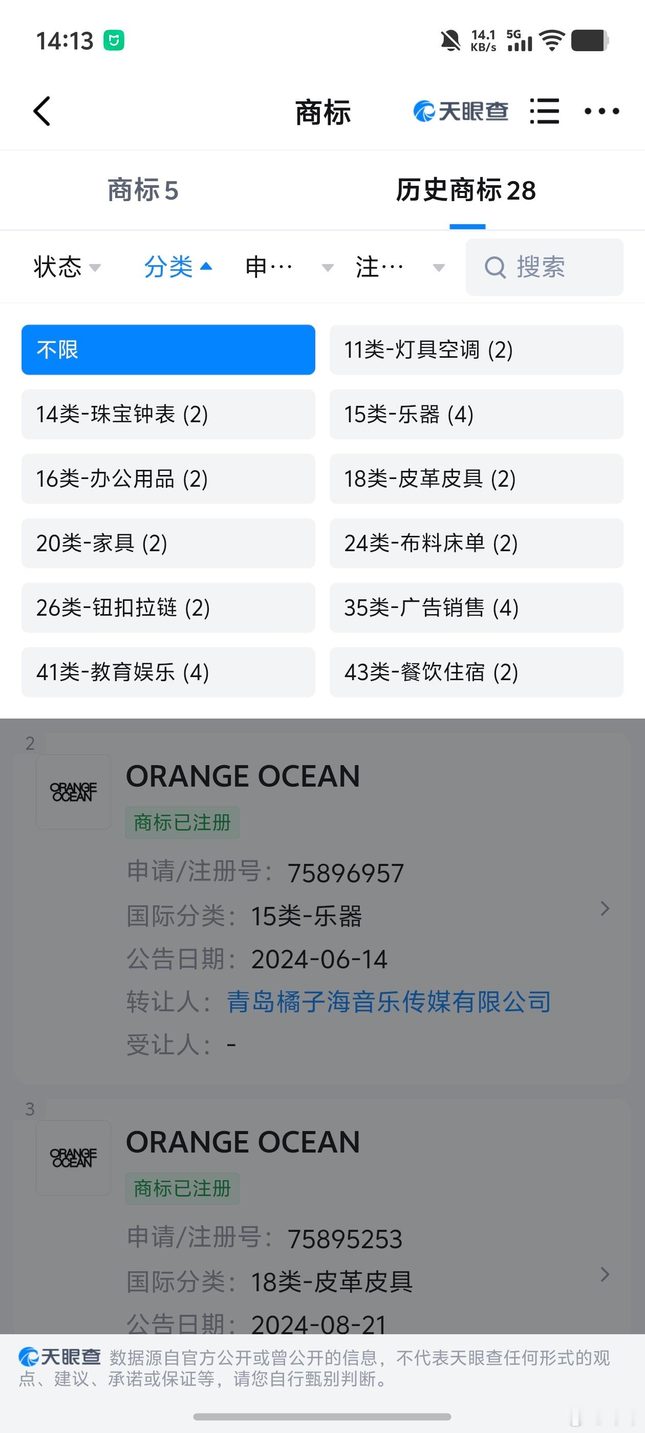 (Ps:查了一下橘子海乐队注册的商标并没有包含手机品类,ORANG OCEAN 的商标注册也被驳回了)