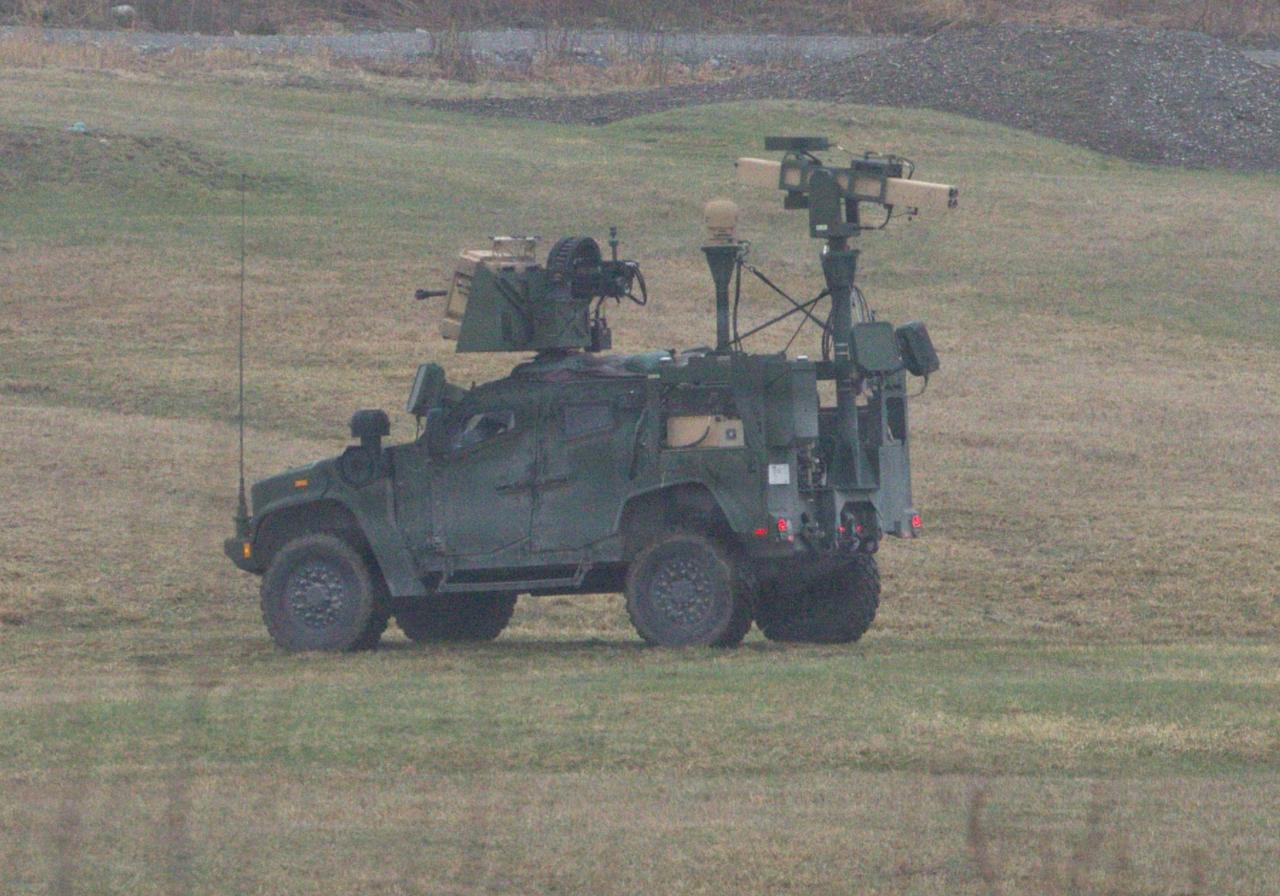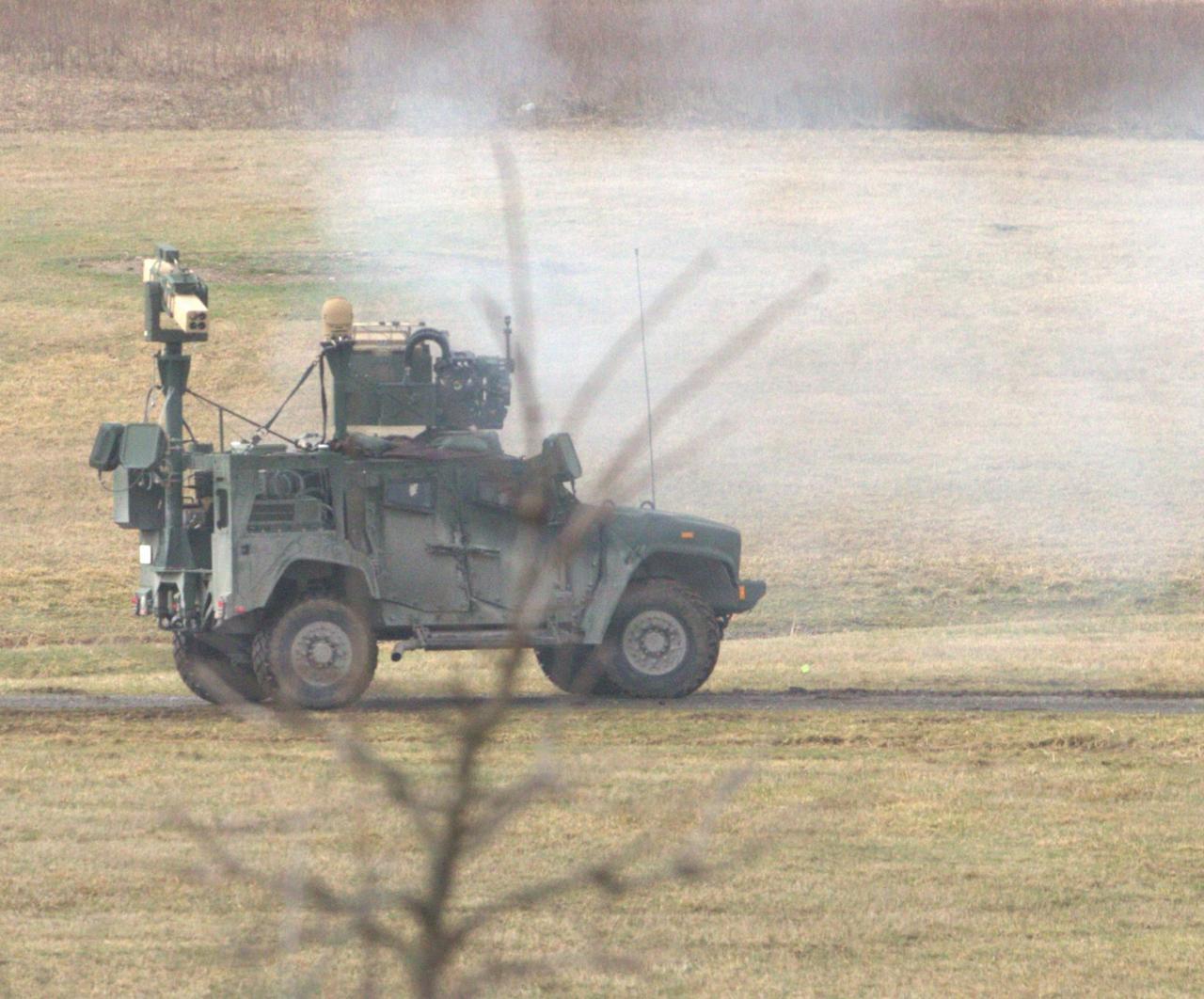 2026年4月14日,在纽约州德拉姆堡举行的实弹演习中,“弹弓刀”反无人机系统正在进行实弹射击测试。“峰会打击'26”是一项联合、多域演习,旨在提升师级参谋人员和参演部队的作战能力,包括计划、协调和运用杀伤力及作战协调能力。