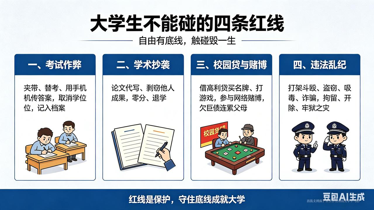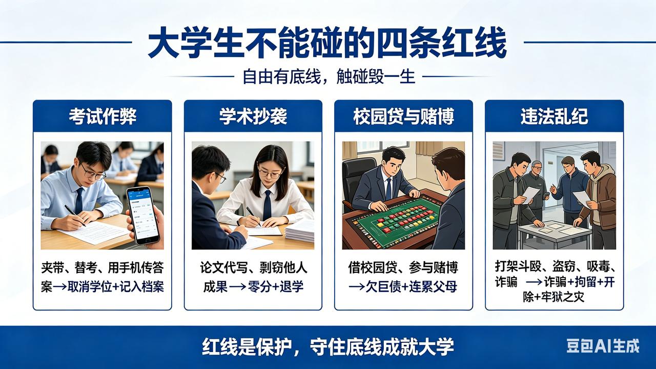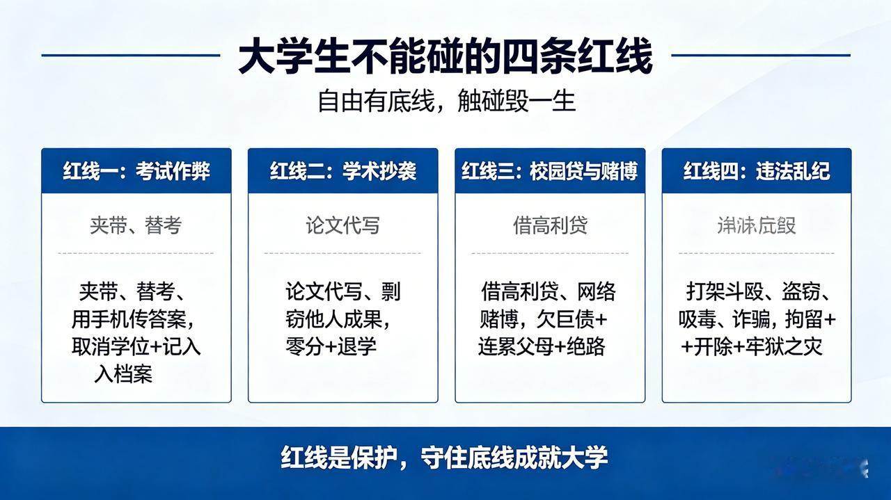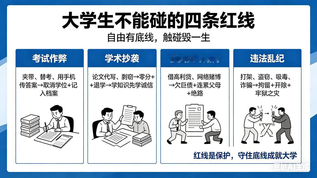 大学生不能碰的四条红线 大学是自由的,但自由有底线。以下四条红线,一旦触碰,轻则处分,重则毁掉一生。 一、考试作弊——夹带、替考、用手机传答案,不仅取消学位,还会记入档案,成为抹不掉的人生污点。 二、学术抄袭——论文代写、剽窃他人成果,被查出来就是零分、退学。学知识先学诚信。 三、校园贷与赌博——为了买名牌、打游戏去借高利贷,或者参与网络赌博,最后欠下巨债,连累父母,甚至走上绝路。 四、违法乱纪——打架斗殴、盗窃、吸毒、参与诈骗。一次冲动或贪念,换来的是拘留、开除,甚至牢狱之灾。 红线不是束缚,而是保护。守住底线,大学才能真正成就你。