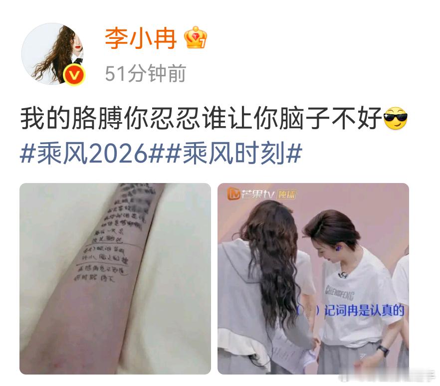 李小冉歌词小抄抄了一胳膊李小冉胳膊忍忍谁让脑子不好 记歌词这一块只有你想不到没有冉子做不到~姐二公小考把歌词抄了满满一胳膊被孙怡姐姐调侃说是纹身,冉自己都跟胳膊说忍忍谁让脑子不好哈哈哈哈太可爱了!这样的女孩没心机!乘风2026