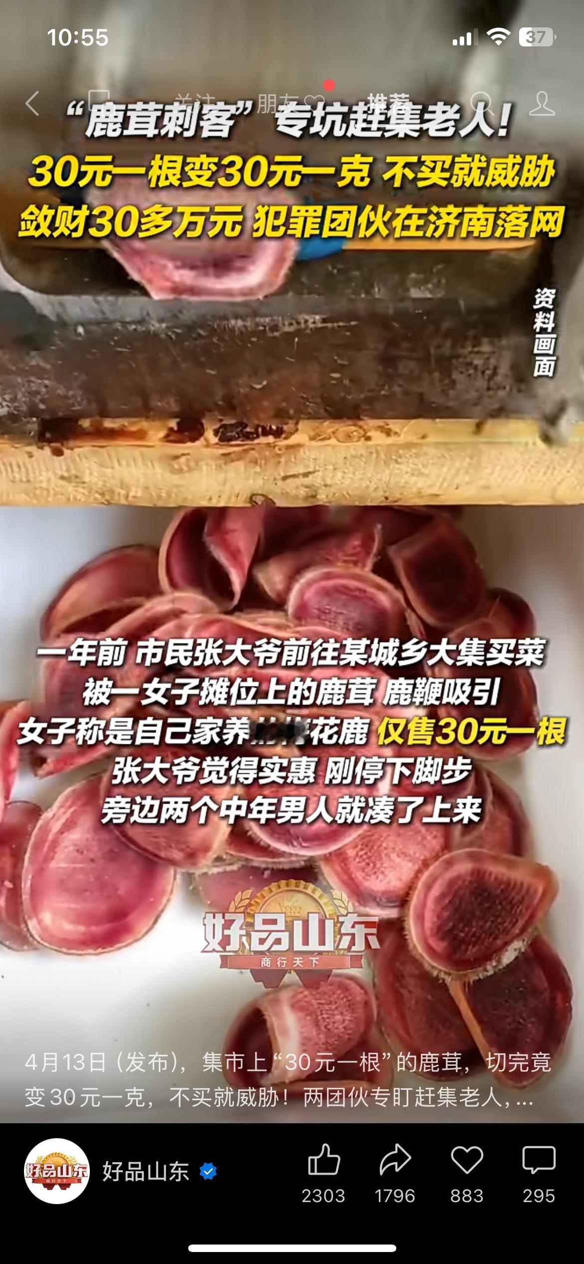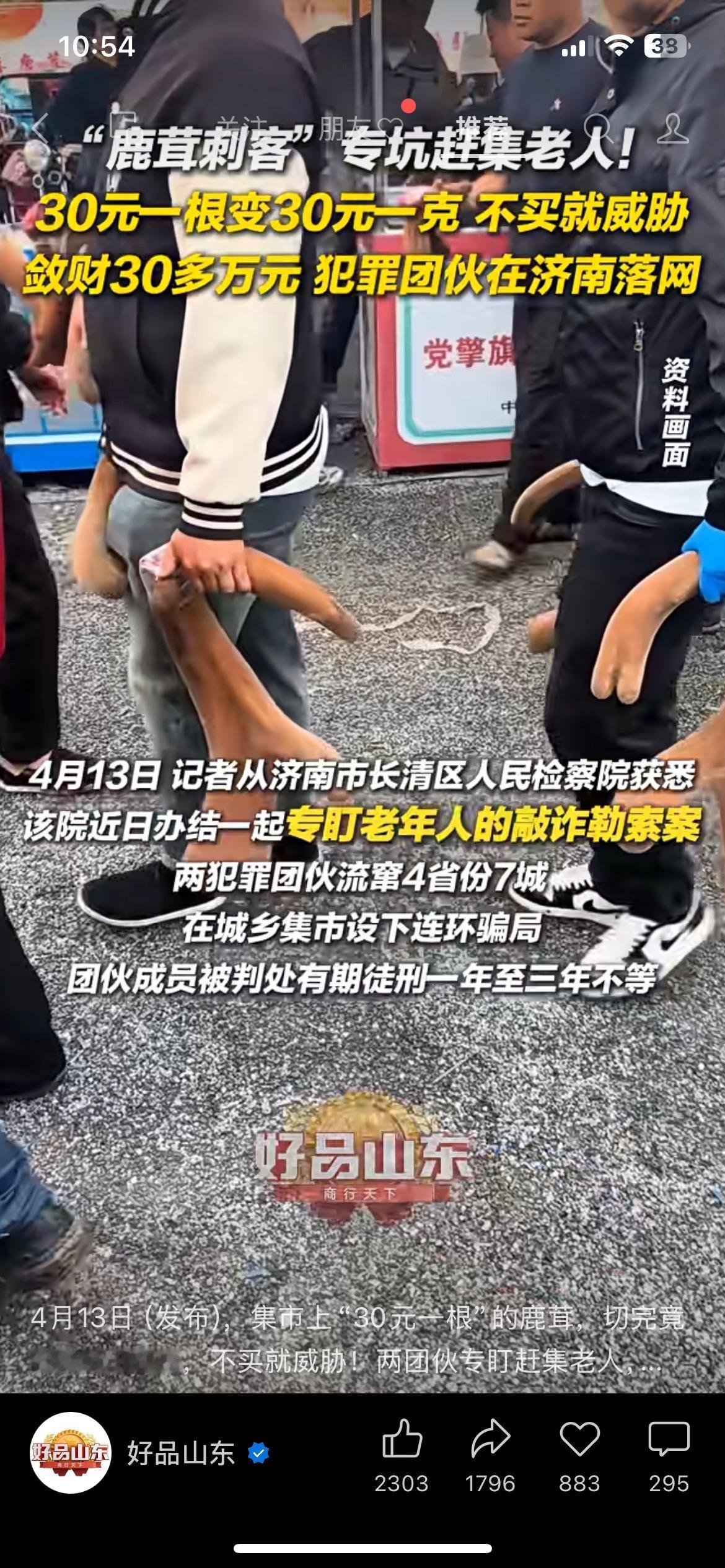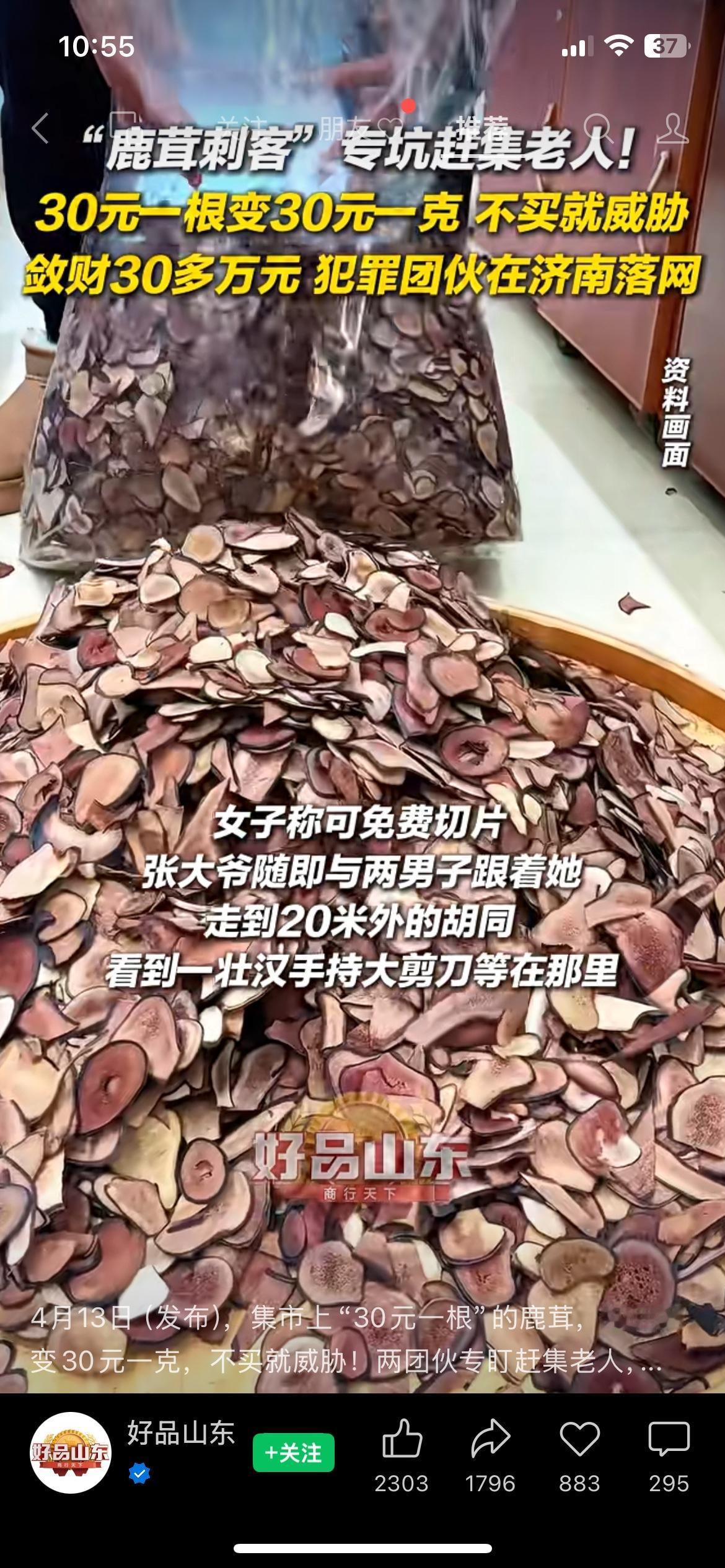 鹿茸刺客”专坑赶集老人!30元一根变30元一克,不买就威胁,敛财30多万落网 梅花鹿鹿茸蜡片 大快人心!济南警方打掉了专坑老人的鹿茸诈骗团伙。这帮人套路极深,先说30元一根,骗到角落切片后改口30元一克,一根卖几千,不买还威胁。他们流窜4省骗了30多万,现在团伙都判刑了。家里有老人的,一定要提醒,集市上这种便宜鹿茸千万别买,全是坑! 防诈骗 老年人安全 社会新闻