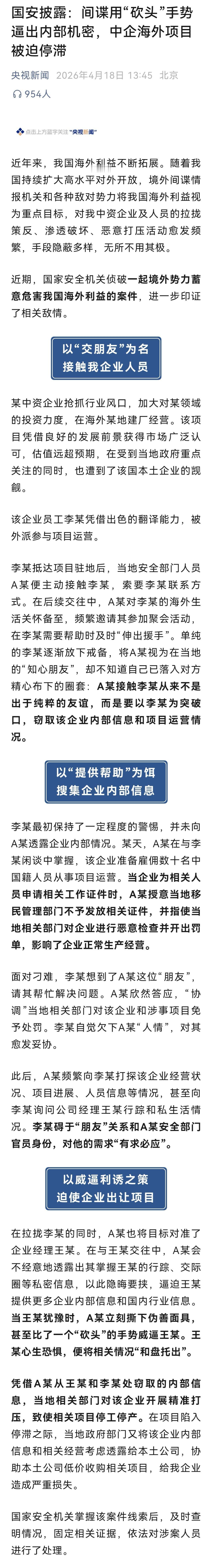 国安披露:间谍用“砍头”手势逼出内部机密,中企海外项目被迫停滞。