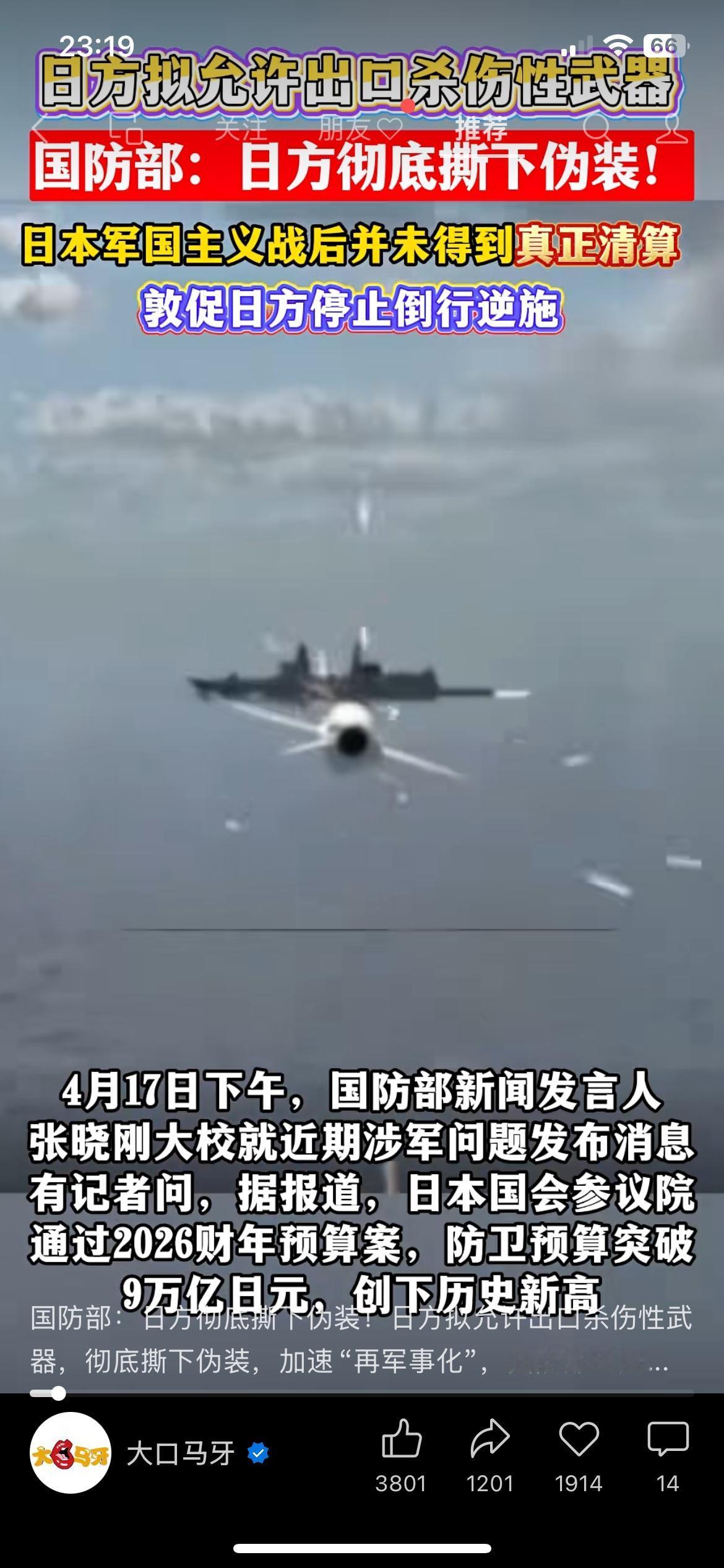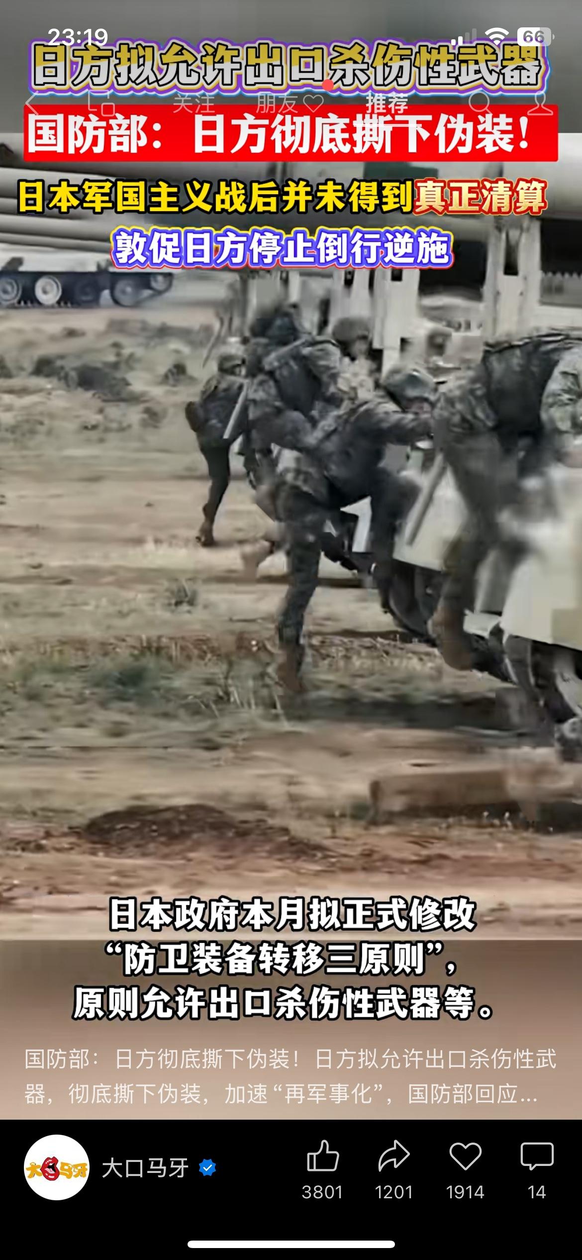 日本拟出口杀伤性武器,国防部严厉回应 日本打算修改规则,允许出口杀伤性武器,防卫预算也创下新高,一直在加速扩军。 国防部直接点名,批评其加速军事化,敦促停止倒行逆施。这种行为威胁地区稳定,咱们必须保持高度警惕。