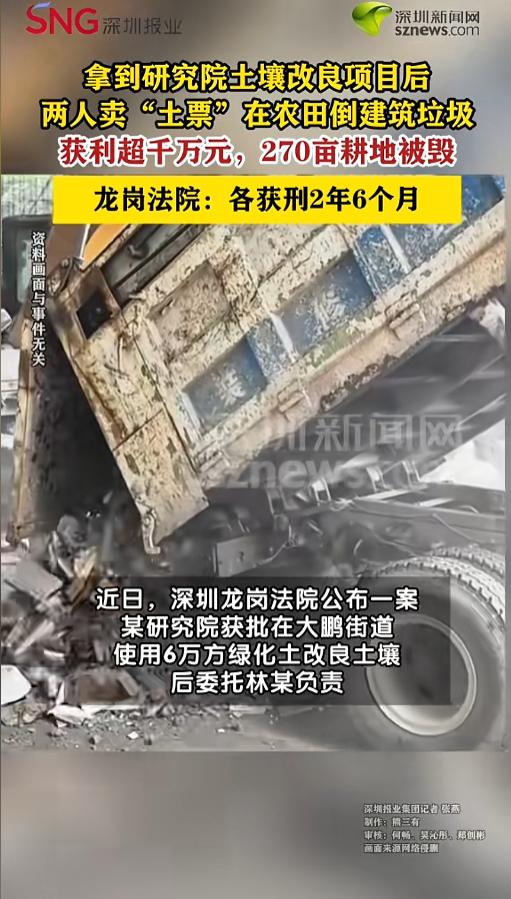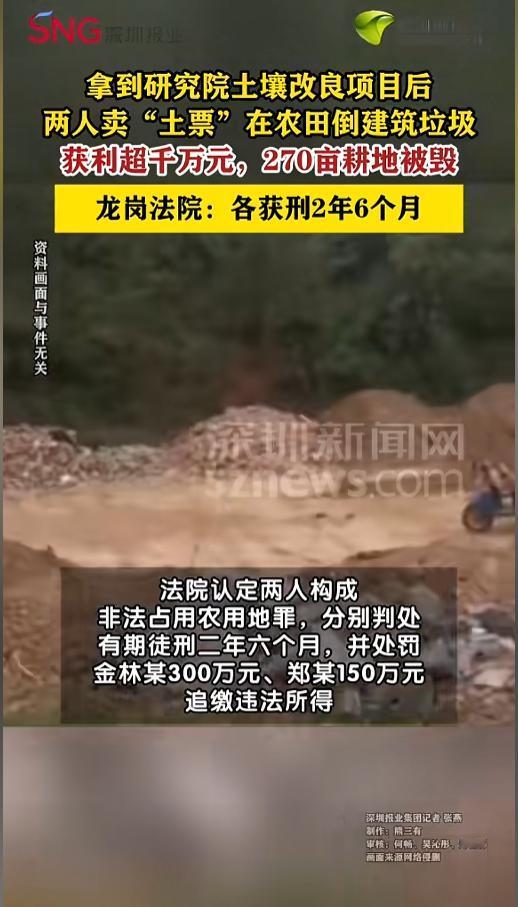 “胆大包天!”近日,广东深圳,当地法院公布了一起损毁农田的案例。两男子合谋,通过销售土票的方式,在农田内倾倒建筑垃圾,最终造成270亩基本农田被毁,非法获利超千万元。最终,二人被判刑2年6个月!网友:判得太轻了! 保护耕地是我国的国策,18亿亩耕地更是红线,每个毁坏耕地的个人和集体,都将受到法律的制裁。 据媒体4月17日报道,当地一家研究院手里,有4块基本农田的使用权,后来,他们获批在其中一个地块上,用优质土进行土壤改良,并且将这个工程,包给了林某负责。 没想到,林某拿到权限后,不仅没进行土壤改良,反而起了歪心思。他找到了郑某,两个人合谋,借着这个幌子,非法填埋建筑垃圾获利。 二人狼狈为奸,郑某负责对外卖土票,收费;林某负责在农田现场指挥倾倒垃圾。短短半年时间,他们就获利1337.8万余元,其中908.3万,都转给了林某。 这半年时间里,原本获批的农田,已经被全部破坏了,后来还蔓延到了其他地块,整整270亩地,都不能再耕种了。 事后,二人犯非法占用农用地罪,被法院判处有期徒刑2年6个月,并分别处罚金300万、150万,两个全部的非法所得,也要被查没充公。 网友看后表示,270亩,获利1300多万,最后就判了两年半,再加上点罚金,这罚金能收上来么?这判的是不是太轻了,耕地红线不容触碰,狠罚才能保护! 信息来源:《【借“土壤改良”之名卖“土票”倾倒渣土,两人非法牟利超千万元】》深圳新闻网