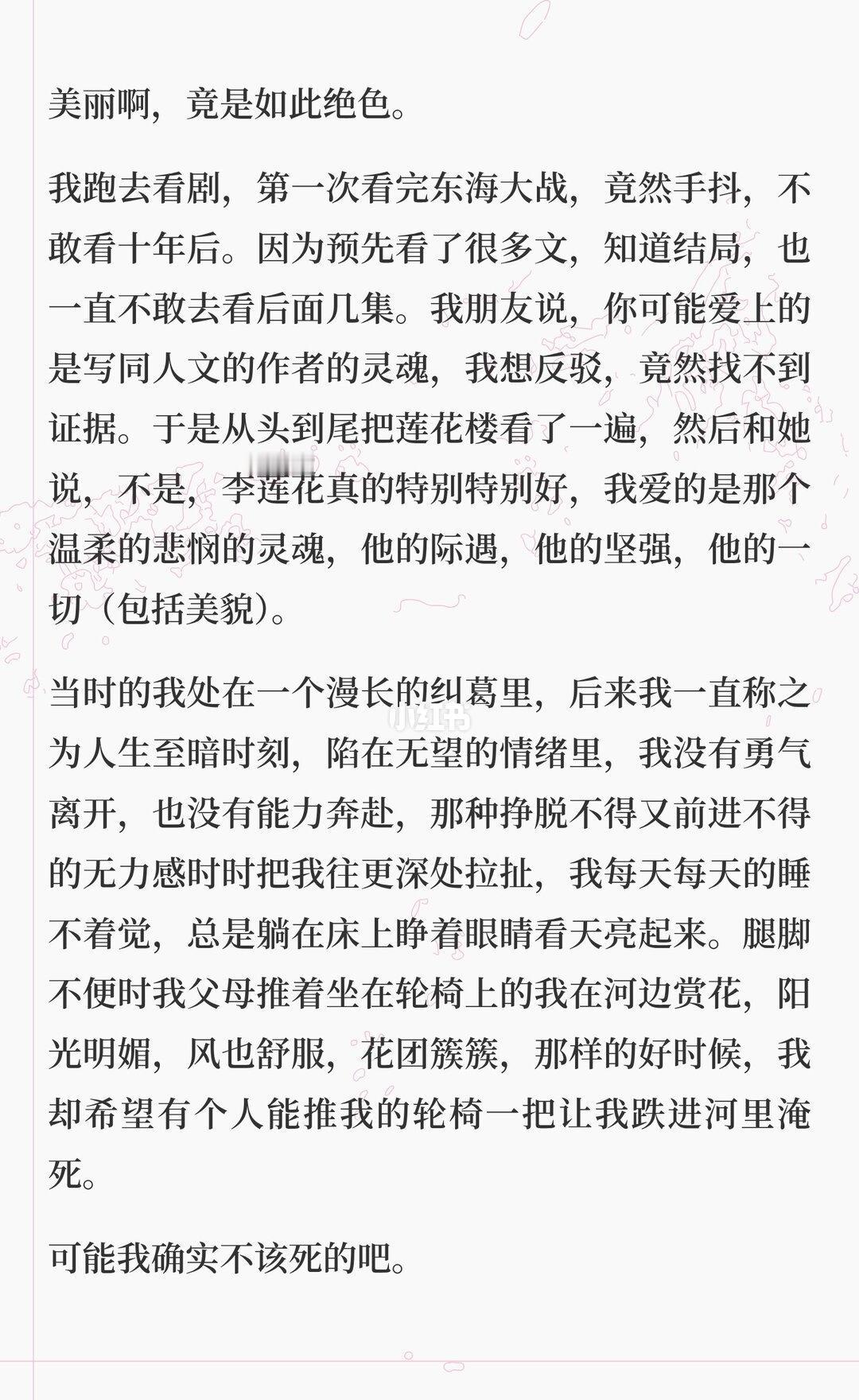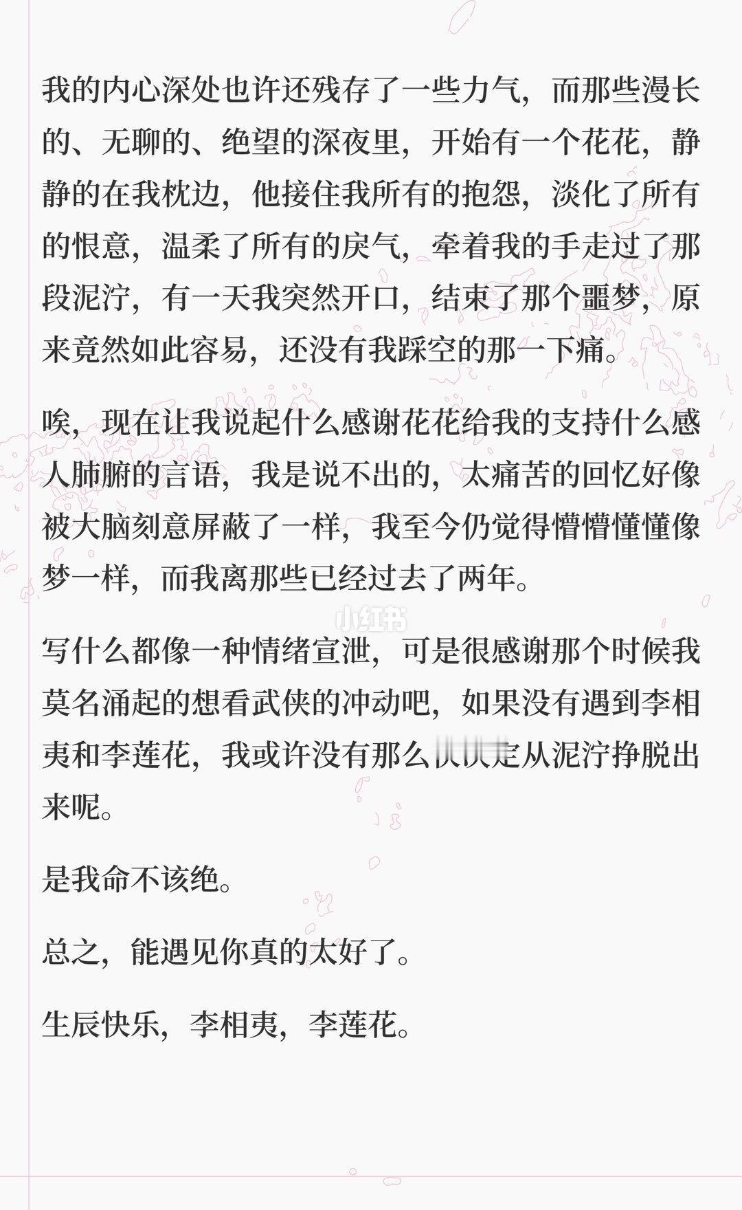 李莲花,人生何处不相逢啊 会突然想起写这么一篇东西,是因为两年前我刚喜欢上李莲花的时候,到处找莲花相关的东西,当时我买了一瓶香水,今发现竟然快用完了。 这瓶香水说是有莲花的香味,但是我确实分辨不出来,我只觉得它很甜,像糖,店家介绍它的时候,写的是——多得是爱我的人 李莲花,你知道吗?你的生命应该是甜的,因为,多得是爱你的人。 一念心清静莲花处处开 李相夷天下第一 长命百岁 成毅 李莲花