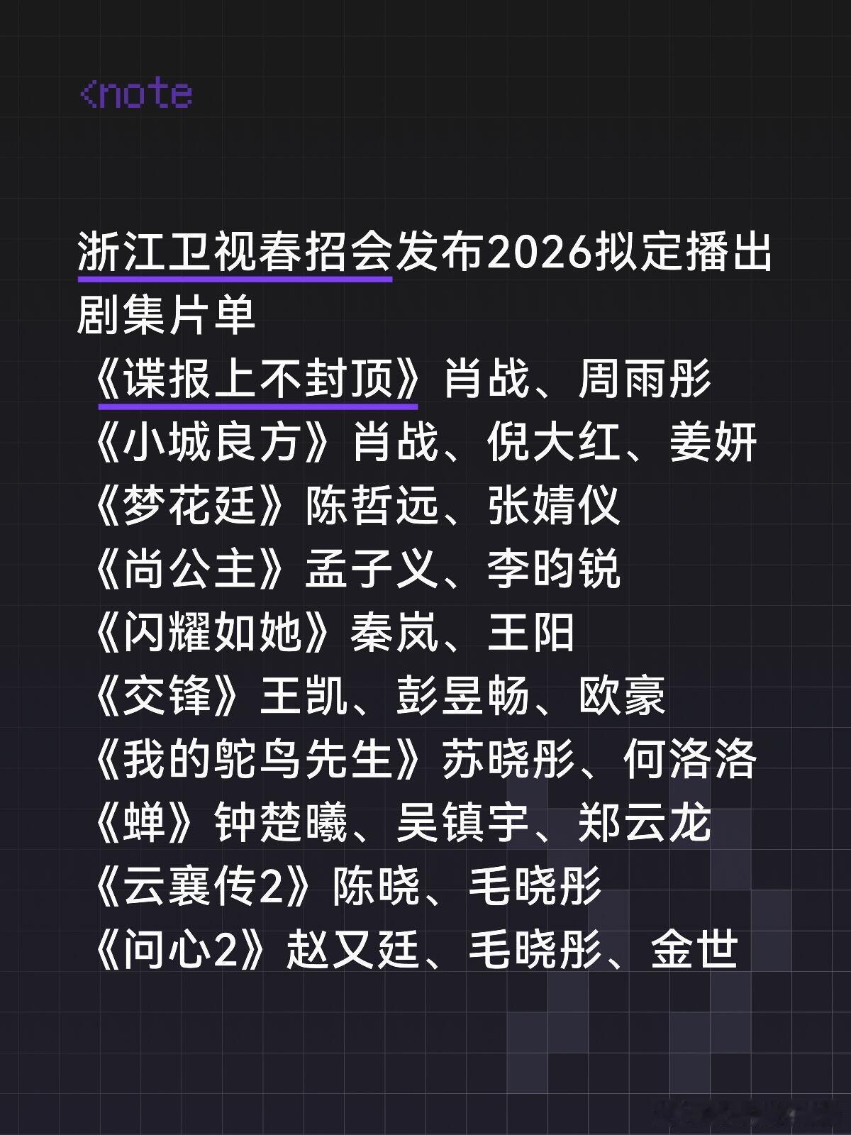 浙江卫视2026春季片单浙江卫视春招会发布2026拟定播出剧集片单《谍报上不封顶》肖战、周雨彤《小城良方》肖战、倪大红、姜妍《梦花廷》陈哲远、张婧仪《尚公主》孟子义、李昀锐《闪耀如她》秦岚、王阳《交锋》王凯、彭昱畅、欧豪《我的鸵鸟先生》苏晓彤、何洛洛《蝉》钟楚曦、吴镇宇、郑云龙《云襄传2》陈晓、毛晓彤《问心2》赵又廷、毛晓彤、金世佳中剧&微短剧《云梦添香》《仙剑奇侠传二·忆如传》《古剑奇谭三之念念不忘》《逐浪1980》