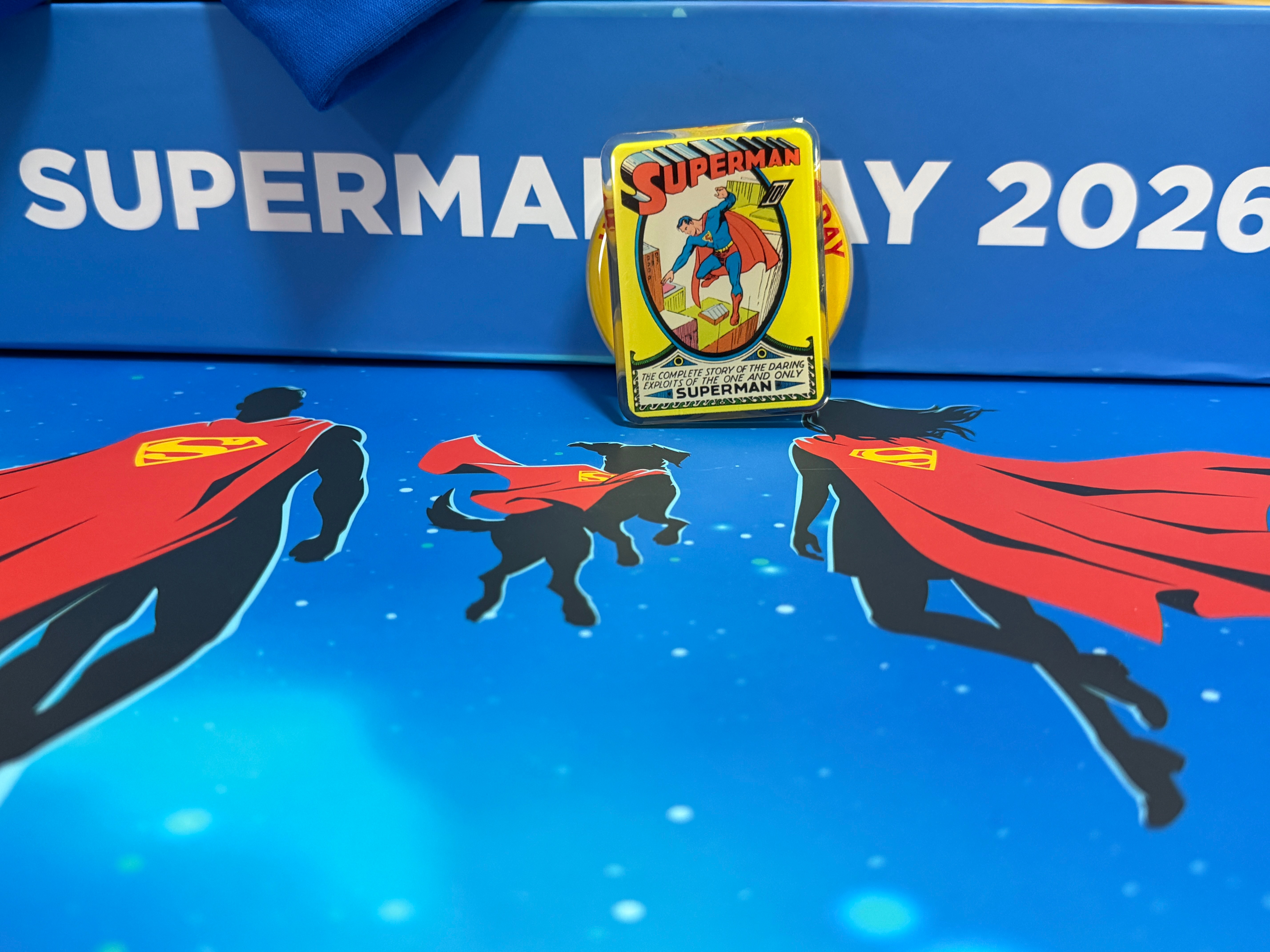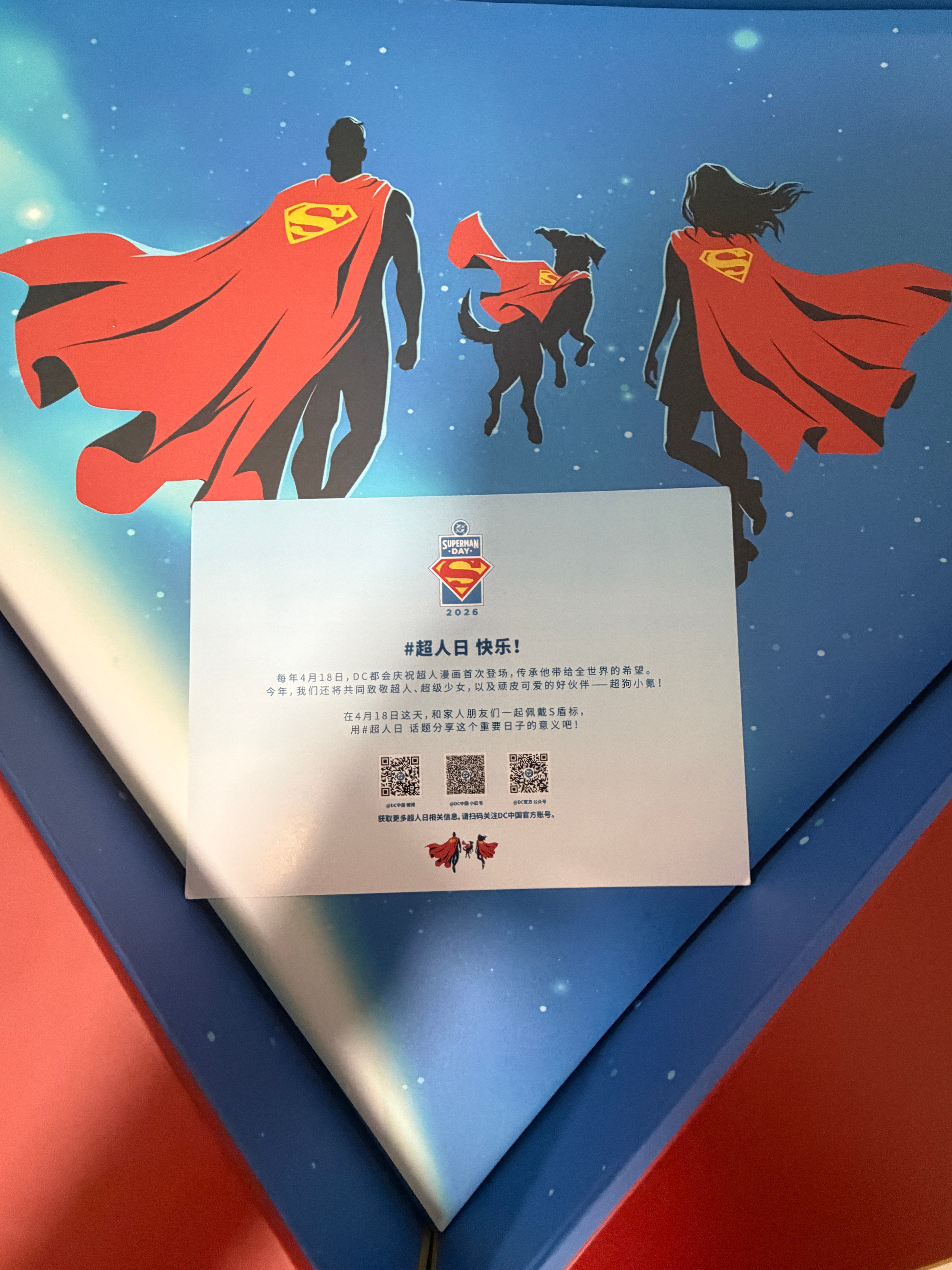 冷知识,每一年的4月18日是超人日,1938年的这天超人首个漫画正式发行,DC今年超人日也为粉丝准备了精致礼盒,礼盒外观经典的超人S标志和红蓝配色,一打开就是超人、超女和小氪的图画,礼盒内有超人T恤、超人款宠物口水巾、徽章、手机支架。