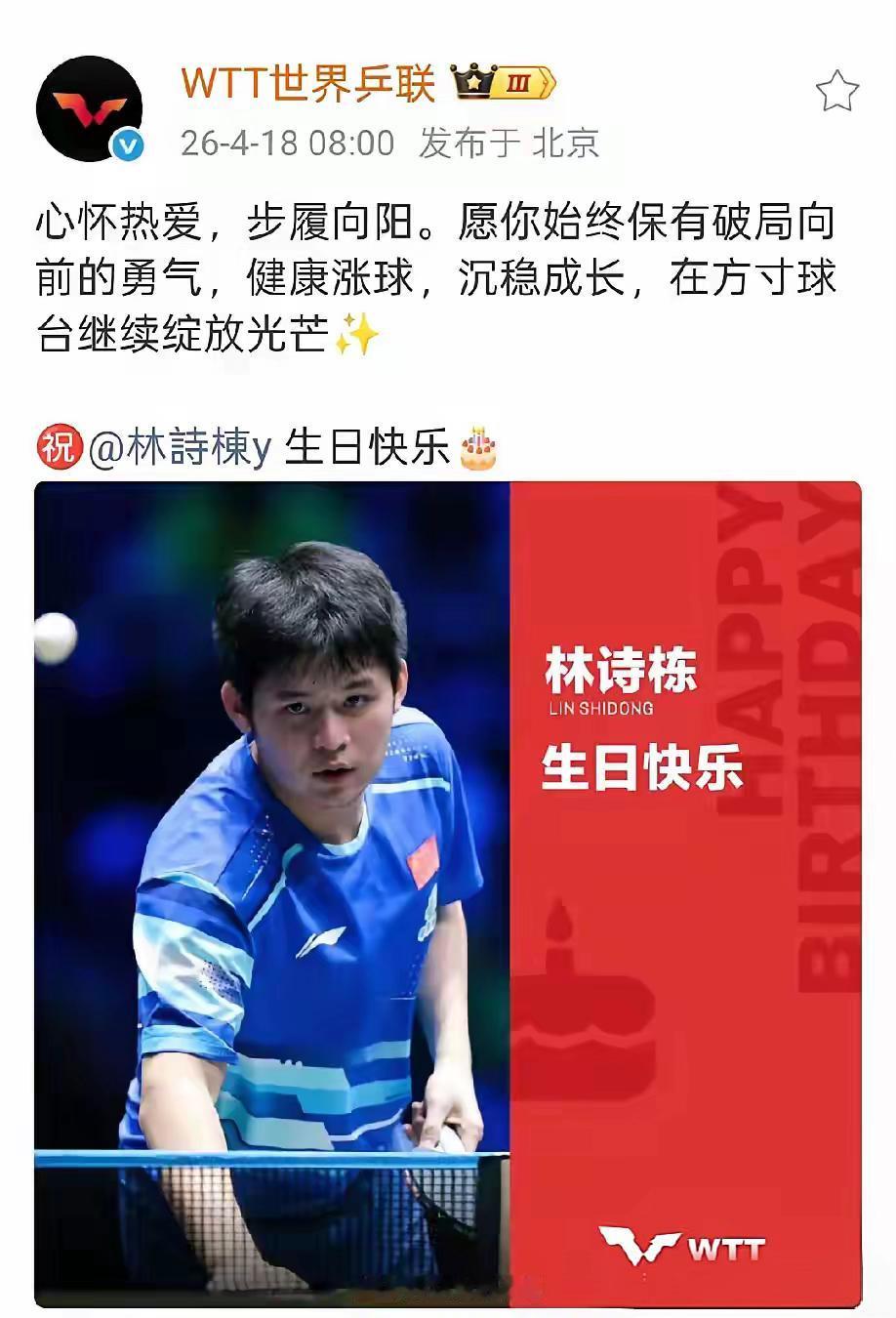 【林诗栋21岁生日,世界乒联微博两次发文祝贺】2026年4月18日,也就是今天,是林诗栋的21岁生日,WTT世界乒联(@WTT世界乒联)在微博上两次发文为他送上祝福。 两次发文内容 第一次(上午) "心怀热爱,步履向阳。愿你始终保有破局向前的勇气,健康涨球,沉稳成长,在方寸球台继续绽放光芒✨。㊗️林诗栋生日快乐🎂" 配图:生日主题海报 第二次(下午/晚间) 形式:短视频/集锦 内容:回顾林诗栋2025-2026赛季的精彩得分、关键比赛瞬间。 配文:"21岁,继续闪耀!" 等简短祝福。 正值伦敦世乒赛团体赛倒计时10天,国乒在成都封闭集训。官方十分重视,WTT连续两年,20岁、21岁为林诗栋庆生,体现对这位史上最年轻男单世界第一的高度认可。 球迷反响强烈,林诗栋21岁生日快乐 话题迅速登上热搜,球迷刷屏祝福他"健康涨球、世乒赛加油"。 春日生活打卡季