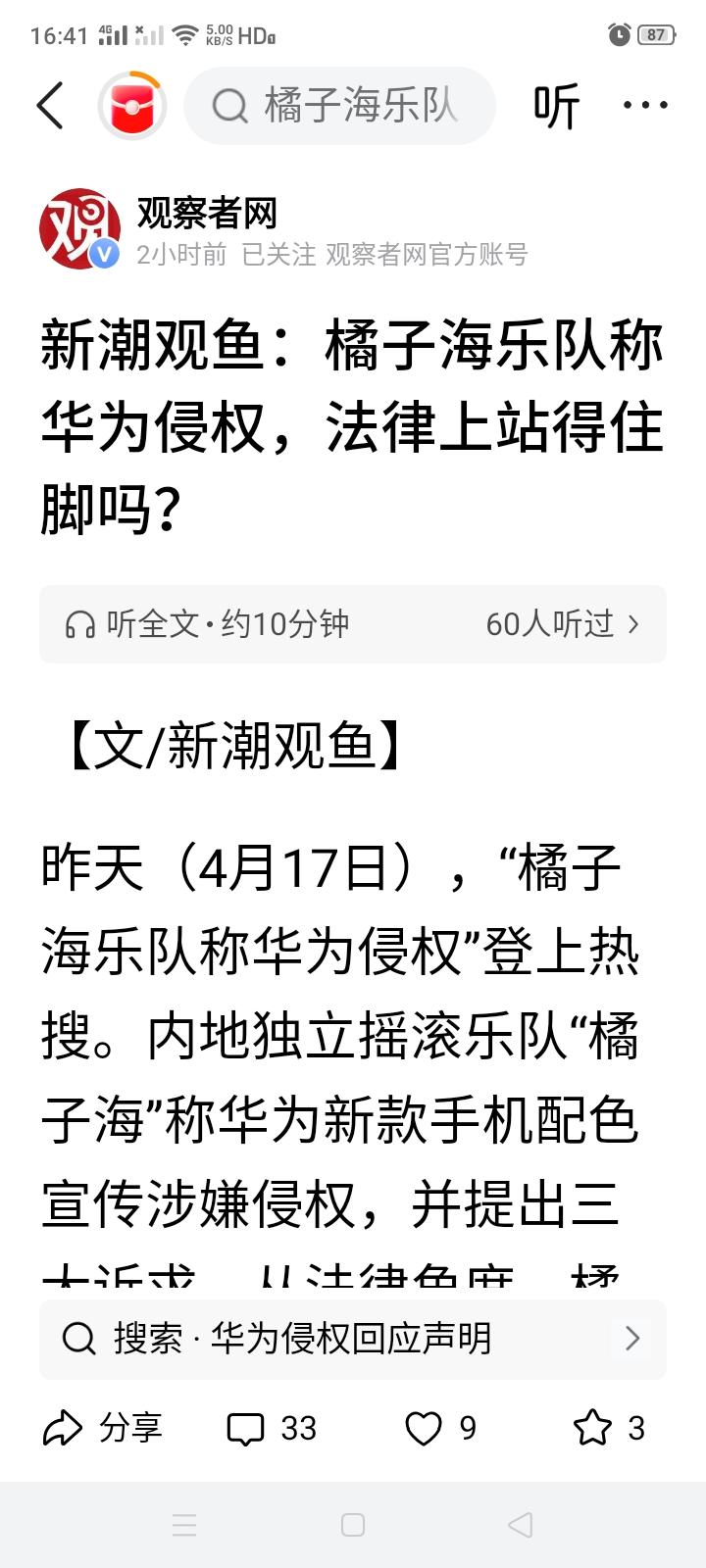 “橘子海”乐队起诉华为一款手机的配色宣传。说实话本人不太看音乐,如果不是这次起诉华为,我以前还真没听说过“橘子海”乐队,更没听过他们的作品,至于这次是谁蹭谁的流量还真不好说。 我相信跟我一样没听说过“橘子海”乐队的人一定比没听说华为的人更多吧,说华为一款手机的配色宣传会侵权一个摇滚乐队,这谁信呢?这是合作不成脑休成怒了吧?为什么合作没谈成?会不会是因为狮子大开口之故?