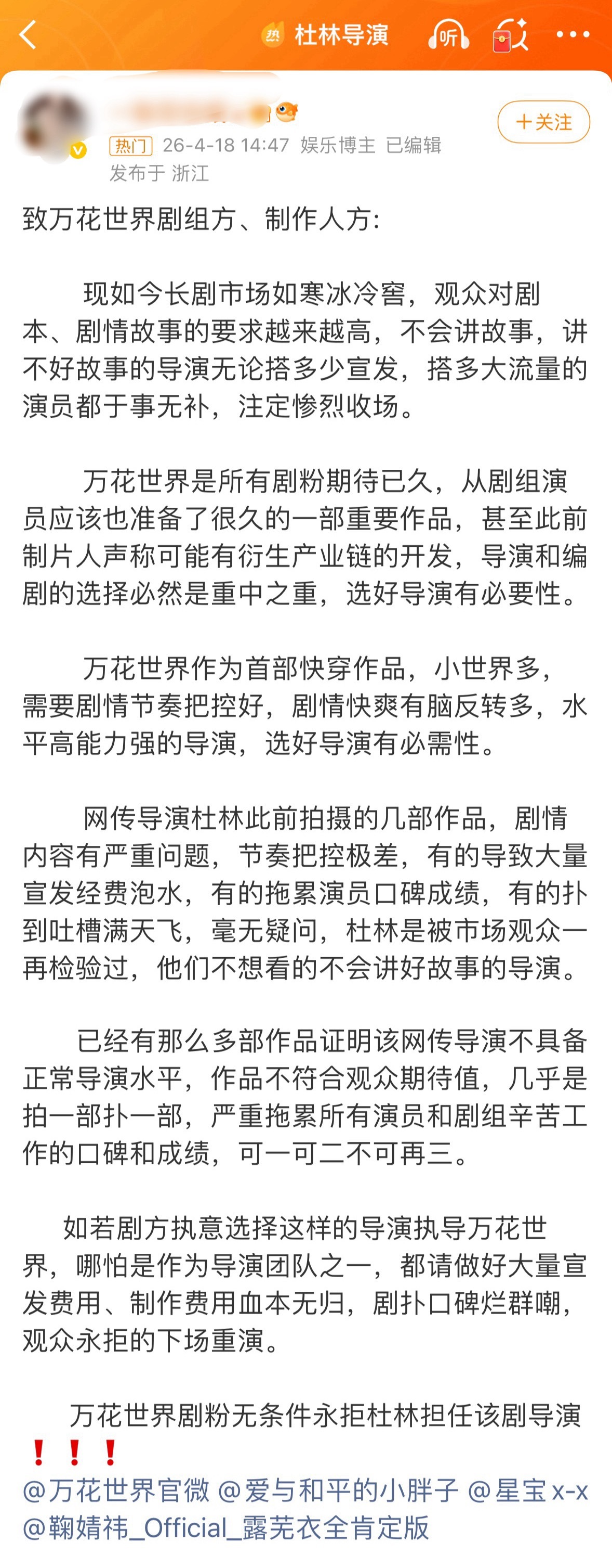 《万花世界》5月开机鞠婧祎粉丝正在维权抵制杜林导演看了下他的作品,不论是豆瓣评分还是口碑都很差,支持橘丝维权❗️