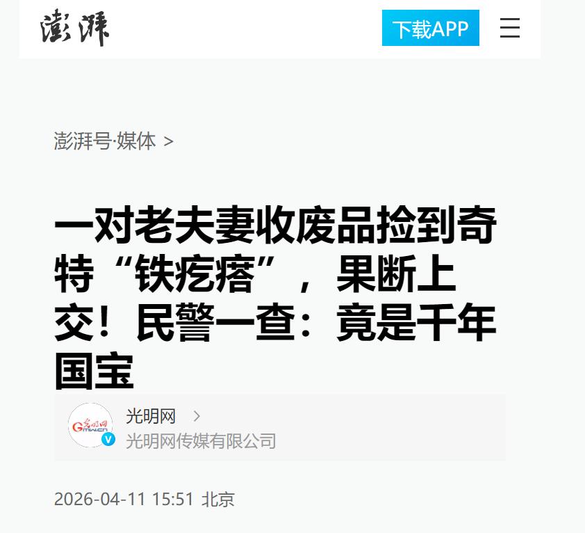 你能顶得住诱惑吗?一对靠收废品糊口的老夫妻河边捡到“铁疙瘩”送派出所,竟意外揭开千年国宝新身份! 4月11日,浙江湖州吴兴高新园区,一场和历史撞个满怀的事情悄然上演。一对平凡的收破烂老夫妻,捡到个又笨又沉的绿锈铁块,想着“这东西不一般”,没敢私存、也没跑去废品站,而是立马送到了派出所。出人意料,警察一看也蒙圈了,赶紧叫专家来。结果一查,这竟是千古吴越那会儿的青铜重器,是真家伙、国宝级的!这一下把现实里“朴实善良”四个字写了大大的加粗。 生活有时真像一出荒诞剧,每天起早贪黑捡破烂的人,成了发现国宝的大英雄。谁能料到,命运的转角处,晦暗的河边会“遇上”中国千年礼乐的荣耀?有些光彩,就藏在泥土和汗水里,被老百姓用本能擦亮。 这事儿一点儿都不夸张,老两口把那块“铁疙瘩”送到派出所,民警现场傻眼不是装的,是真的没见过。 当他抠掉些锈斑,隐约看见古老云雷纹,心跳有点快。赶忙联系文物局专家,不久后现场队伍像刑侦破大案一样进进出出,动静不比电视里差。 等到专家干净利索地实验、鉴定、询问后,宣布:“这可不是废铁,是春秋战国‘句鑃’青铜乐器,千年文物!”老夫妻暴露了一种让人羡慕的“天生直觉”,普通人和国宝之间,原来也有缘分。 若说中国这么多年,有多少文物非得考古队才能挖出来?其实好些“地下国宝”,都是被最没有防备的普通百姓在提篮小卖、田头插秧、放牛砍柴时发现的。比起专家的学识,这种“人间机缘”更让人感叹。 老夫妻的生活一点儿也不神秘。天天骑个破三轮,细细搜垃圾堆,有时挑灯夜战,有时跟废品站老板斗法。他们见多了社会和人生的角落,凭直觉看出“货色”里的猫腻。 那天一摊泥里,老太太瞅出异样,老头儿一手掂量“这铁块不对劲,沉得邪乎”。磨人的生活磨不去老一辈子里的那点质朴。 他们能分清废铜烂铁和珍贵宝贝,靠的不是书本,而是几十年撸起袖子干活养成的“本事”。能不动心、能麻利上交,说起来平淡,实则温柔而勇敢。 老街坊常说:“穷人的心思最软,但底线最硬。”看上去最平凡的双手,也许守得住历史最沉甸甸的东西。这年头人设易碎,真诚极珍贵! 别看湖州不是最著名的考古大市,但一有“东西”,专家们值班效率很高。现场专家拿着小刷子,边擦边说话,旁边民警用手机查古物图库,气氛像极了侦探推理。 几分钟后专家看真迹、翻资料、根据器物纹路拿出结论,用一口标准腔调说“春秋战国吴越重器没错了”,连旁观记者都屏住气。 专家说句鑃是礼乐器,地位不低,跟咱们中原的编钟一档,重要场合敲它,声音不是给娱乐用,是要祈福敬天祖的。比电视里那些文物宣传更带感,因为活生生从“废品山”里捡出来的故事,本身就很传奇。 许多文物的真正价值,并不是高价背后的标签,而是它们承载的历史记忆和文明密码。句鑃这种文物,不只是一块铁疙瘩,更是一则关于吴越古国的声律名片。 老夫妻的决定未必轻松。换成别的人,捡到一块稀奇宝贝,小算盘瞬间开动“偷偷卖”虽违法,但见利忘义往往只隔一层窗户纸。 可总有“硬核”老百姓,他们最有机会贪却最舍得交,实则社会能量最强。为什么?因为他们知道“啥能留,啥不能留”,比教科书更懂规矩、责任和良心。 社会舆论总爱渲染“平凡人的高光时刻”,但我觉得这种故事最打动人的,是无关风月和套路,而是“咱自己的家底”。 如果所有国宝都任人买卖,我们孩子以后还能看到什么?这回文物局顺利收到句鑃,说到底,是靠了普通人的小心机加善心,更靠全民的规矩感。 守住底线比捡到宝贝更难得,不少人嘴上讲“历史是大家的”,关键时刻却不愿意自己吃点亏。 历史需要“沉淀”,也需要每一代人守护得住。老夫妻这一笔,虽然小,但却浓墨重彩。他们没有惊天动地的口号,用行动教会了无数人:就算是最微不足道的岗位,同样能成为传承中华文明的一道光。 有网友半玩笑半认真:“要不要给老夫妻立块牌坊?至少让孙子有面子!”转头又有人支招:“要多搞一点文物知识下乡,让大家分得清宝贝和破铜烂铁,咱国家的好东西才能更安全。” 社会有时候,顶流不是流量明星,而是平凡善良的普通人。你看,一块铁疙瘩,也能把全国人民的心拧起来! 你觉得如果你碰上了,会不会也像湖州老两口一样,坚持把宝贝交给国家?还是说会忍不住有点私心?舆论、法律和良心,哪个更重要?