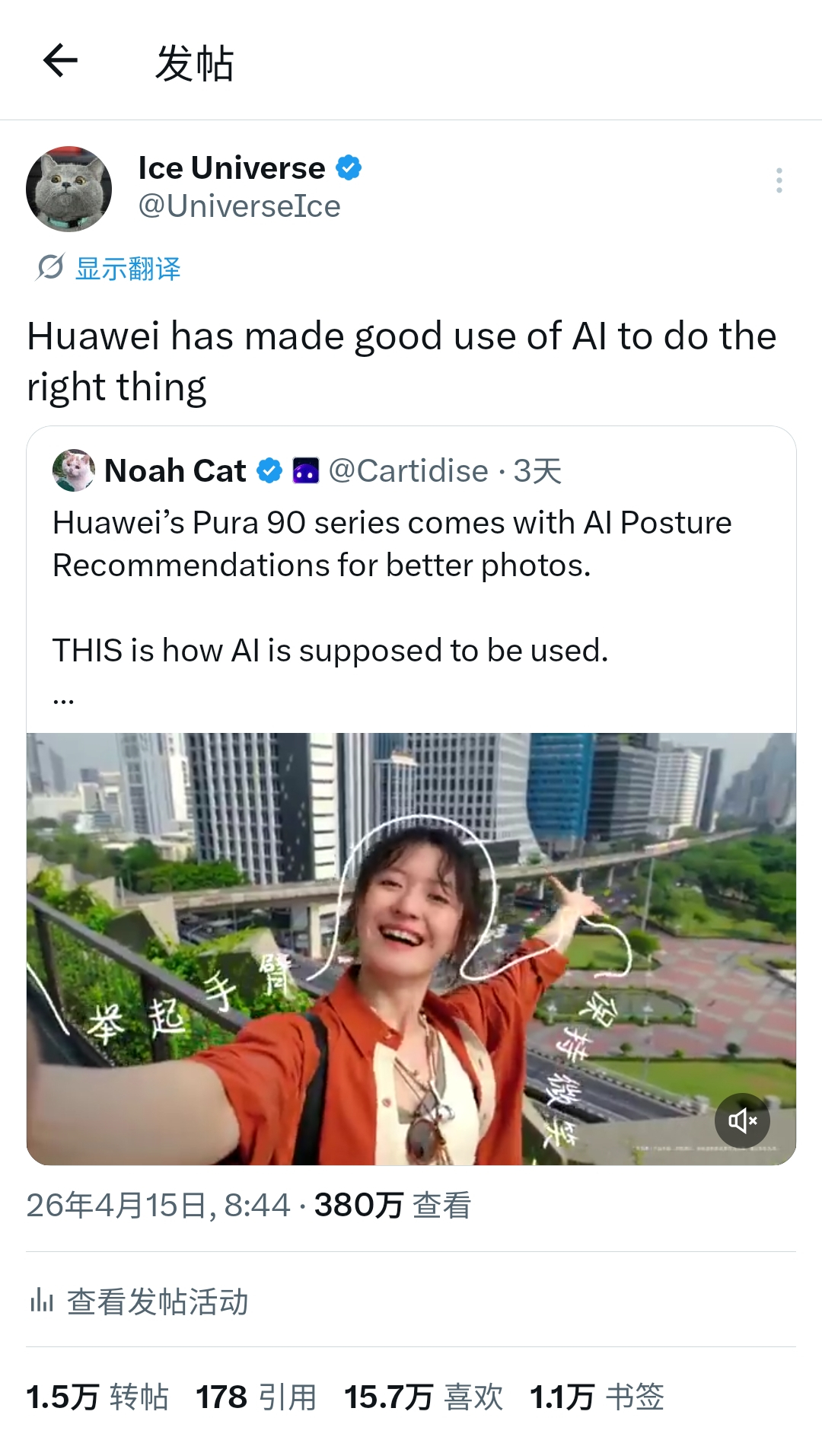 华为AI拍照姿势在外网火了其实很多老外用户至今对华为都念念不忘,尤其是欧洲用户