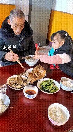 注意看!这一幕真的暖到心坎里!吃饭时,3岁的重孙女瞅见太爷爷手抖夹不住菜,立马拿起筷子给太爷爷夹鱼。她小胳膊挥着,左夹一块右夹一块,咋夹都夹不稳,鱼肉掉桌上了也不慌,捡起来又往太爷爷碗里送。 太爷爷笑得合不拢嘴,满眼都是宠溺。这哪是夹鱼啊,分明是把最纯的孝心递到了长辈手里!小小年纪就懂孝顺,把长辈放在心尖上,这才是最珍贵的家风传承。家有一老,如有一宝,这般祖孙情,真的太治愈了!萌娃 感人瞬间 正能量
