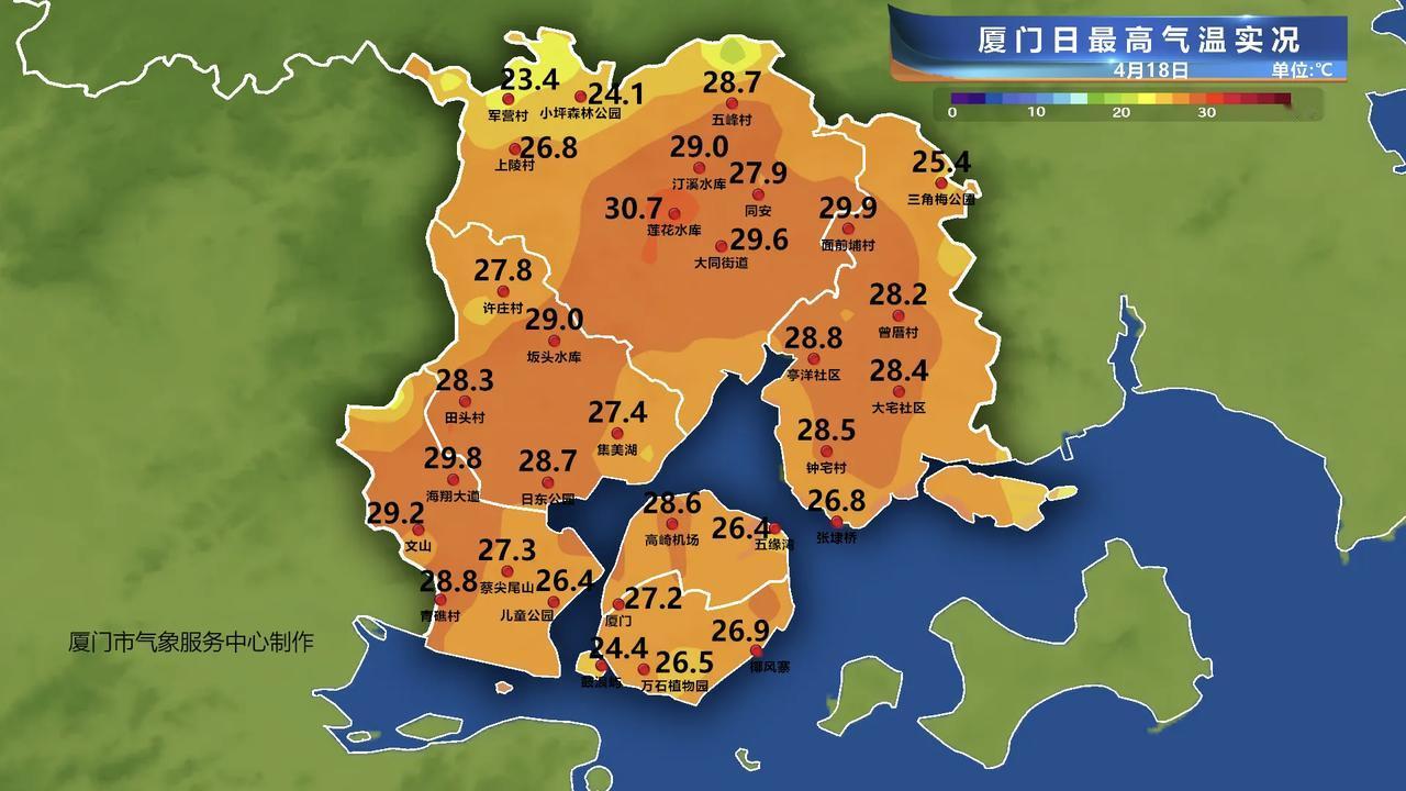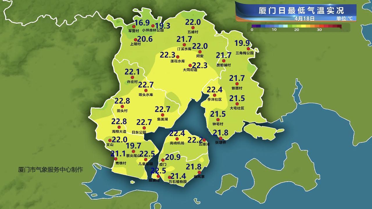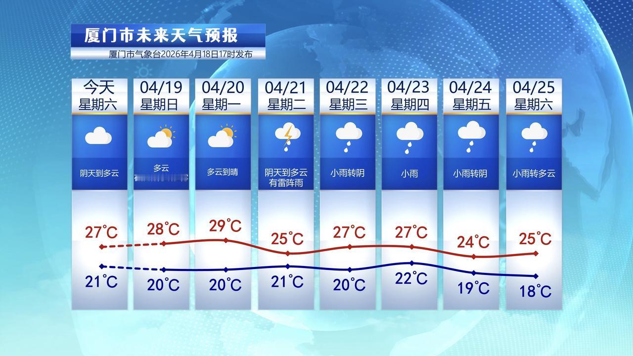 【4月19日至25日,厦门未来七天天气预报】 今天厦门气温还是比较的,下午的光照还是比较强的,紫外线强度大。 今天东渡本站最高温27.2℃,最低温20.9℃,岛外部分站点最高温超过了30℃。 明后天,厦门气温较高,并且保持多云天气,但是到了21日,一股弱冷空气补充,厦门会有一定降温。 同时,由于冷暖空气交汇,21日~25日,厦门会有降雨,不过雨量不是很大。 总的来说,未来一段时间,厦门先晴后雨,大家出门前多关注天气变化。厦门旅游天气