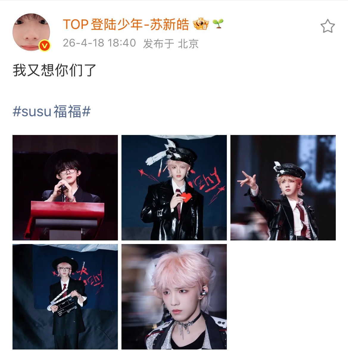 苏新皓表白粉丝我又想你们了 苏新皓更博,文案表白粉丝:我又想你们了发了演唱会舞台照和后台花絮!帅气又迷人精致的小苏想舞台了!苏新皓发了演唱会舞台照