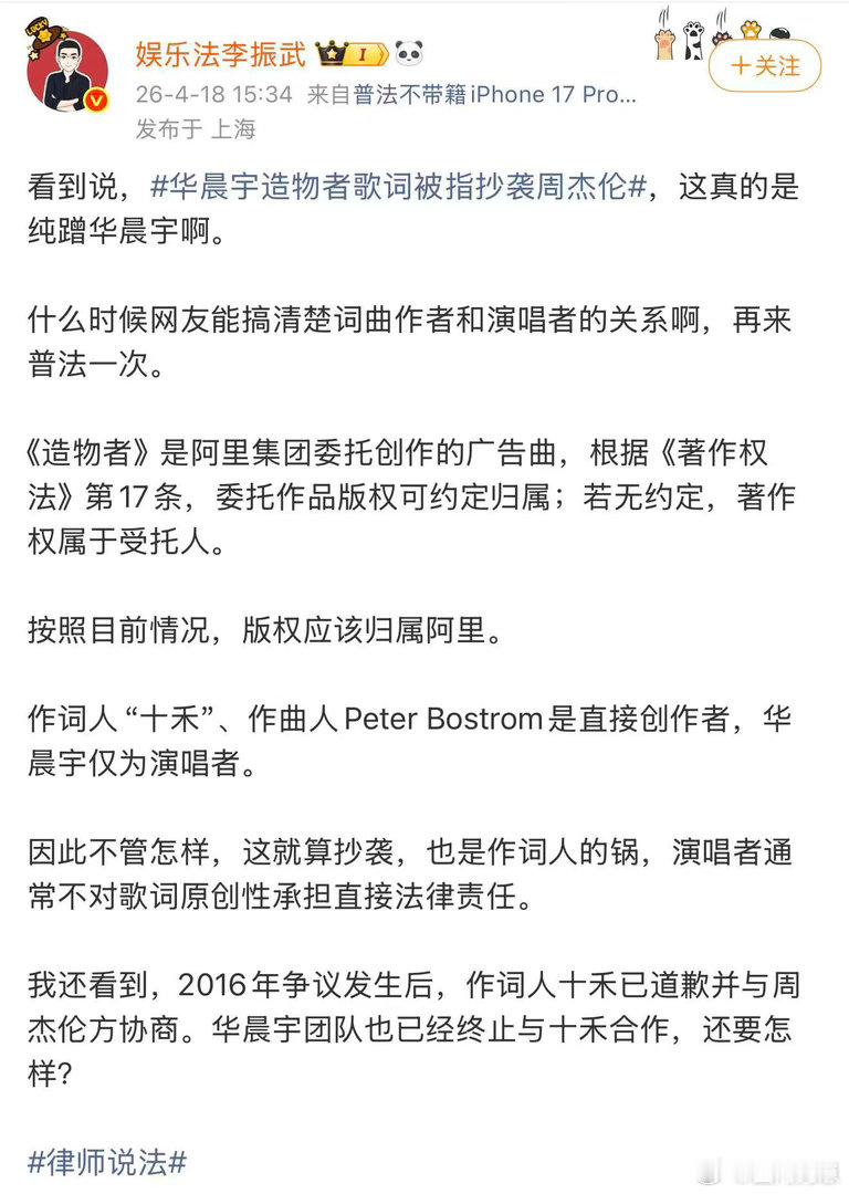 律师称造物者抄袭与华晨宇无关 律师明确表态,歌曲抄袭争议与华晨宇无关,他仅负责演唱,不涉及词曲创作,请勿过度关联与造谣。
