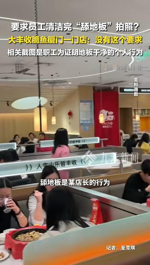 “离了个大谱!”近日,福建厦门,有网友发视频称,一饭店打扫完卫生后,需要舔地板拍照上传。视频引起了轩然大波。事后,涉事饭店回应称,这是员工个人行为,为了证明卫生干净,并非饭店工作要求。网友:大清不是亡了么! 据媒体4月16日报道,该网友发布的视频显示,一位员工用舌头舔了地板,照片上好还配文,“洁净,是美学,也是底线”。网友发布时称,这个消息是他从一个朋友那里听来的,他这个朋友在这家饭店里上班,被这么要求。 视频发出后,网上反响热烈,不少网友都怒斥,饭店践踏人格尊严,对此展开了声讨。那么,事情真的是这样么? 涉事店家回应,他们没有这样的要求,照片是以前拍的一个夸张宣传,舔地板的是一位店长,为了证明地板是干净的。另一个店的员工也回应,这是员工的个人行为。 事后,该店家报了警,平台也认定内容不实,该网友也已经将内容删除。 尽管如此,但广大网友并不买账,证明地板干净的方法有很多种,为什么非得选择这个呢?而且,作为一个饭店,最应该保持干净的是食材,何必拿一个地板说事。 这种并不是为了证明卫生有多好,更像是哗众取宠,或者宣扬自己的权威。真的为了干净,就应该去死磕厨房、食材! 信息来源:《4月16日,福建厦门,大丰收脆鱼一
