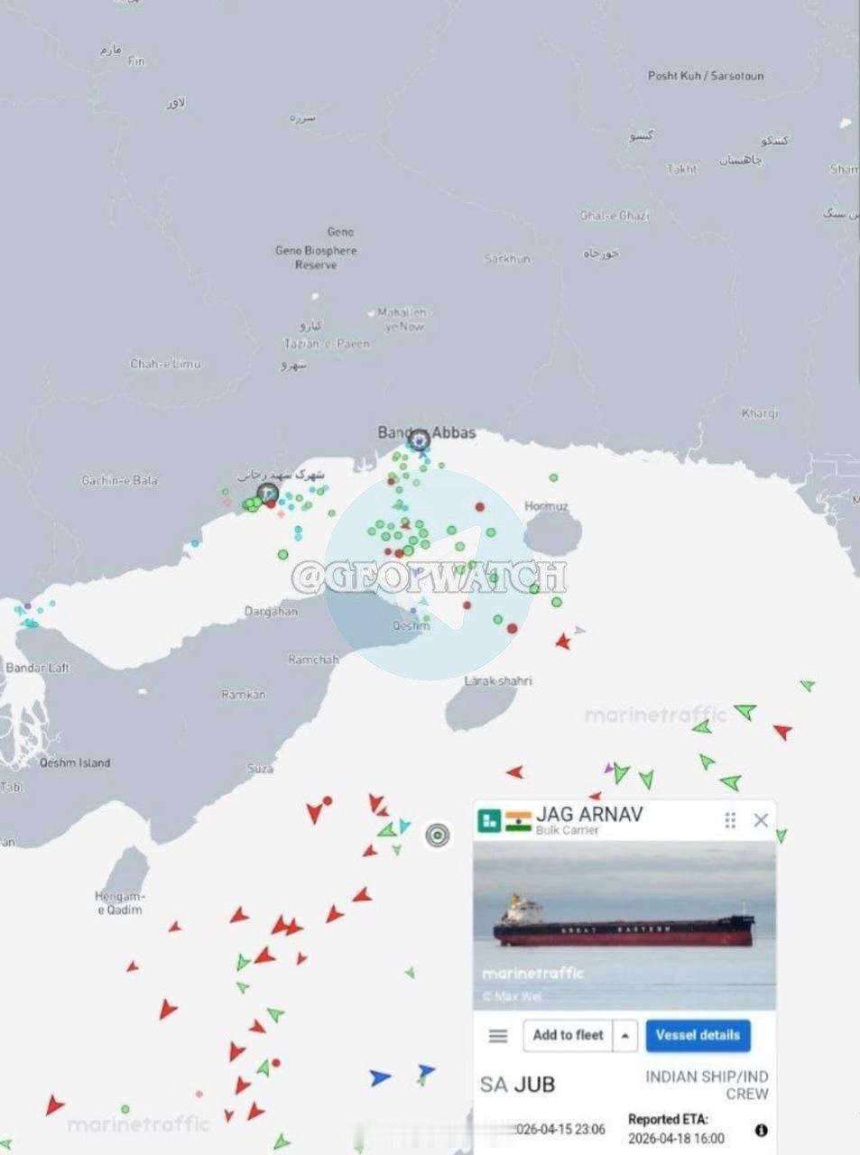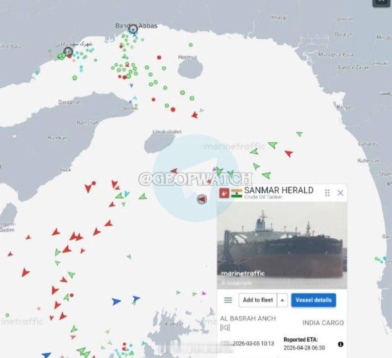 霍尔木兹海峡开放 两艘悬挂印度国旗的船只——超级油轮(装载约 200 万桶伊拉克原油)和散货船——被炮火袭击迫使偏离通往海峡的航线,现在正向西返回海湾。