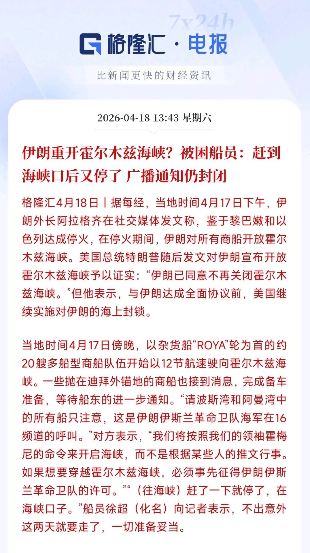 真实的霍尔木兹海峡来了,和特朗普说的完全不一样,美股要栽了特朗普昨天宣布霍尔木兹海峡已经开放,但是滞留在霍尔木兹海峡的油轮在通过海峡的时候已经被伊朗拦截了回去。也就是说,目前霍尔木兹海峡并没有开放,还是处于封锁状态,特朗普说的是虚无缥缈的事。