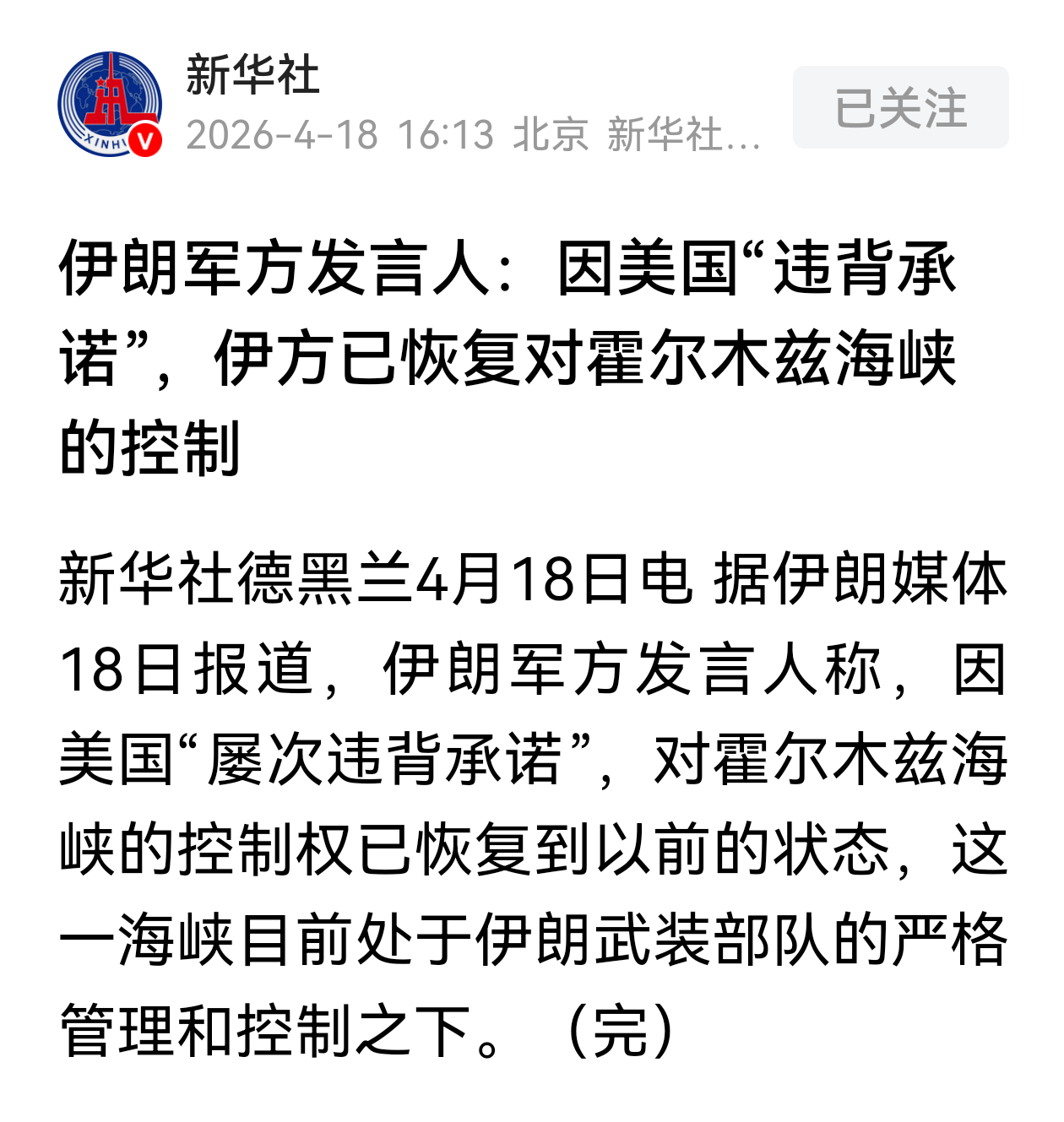 伊朗军方:因美国“背信弃义”伊方已恢复对霍尔木兹海峡管控。