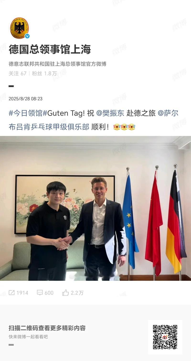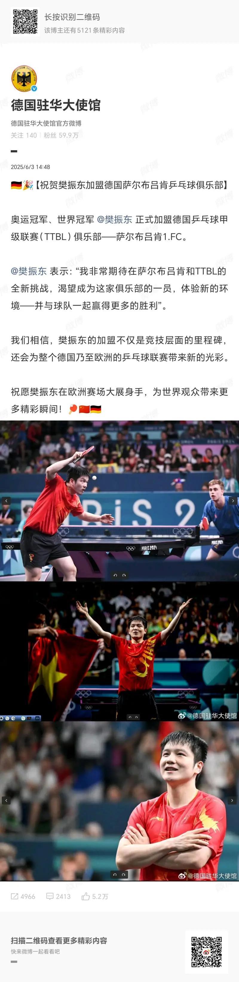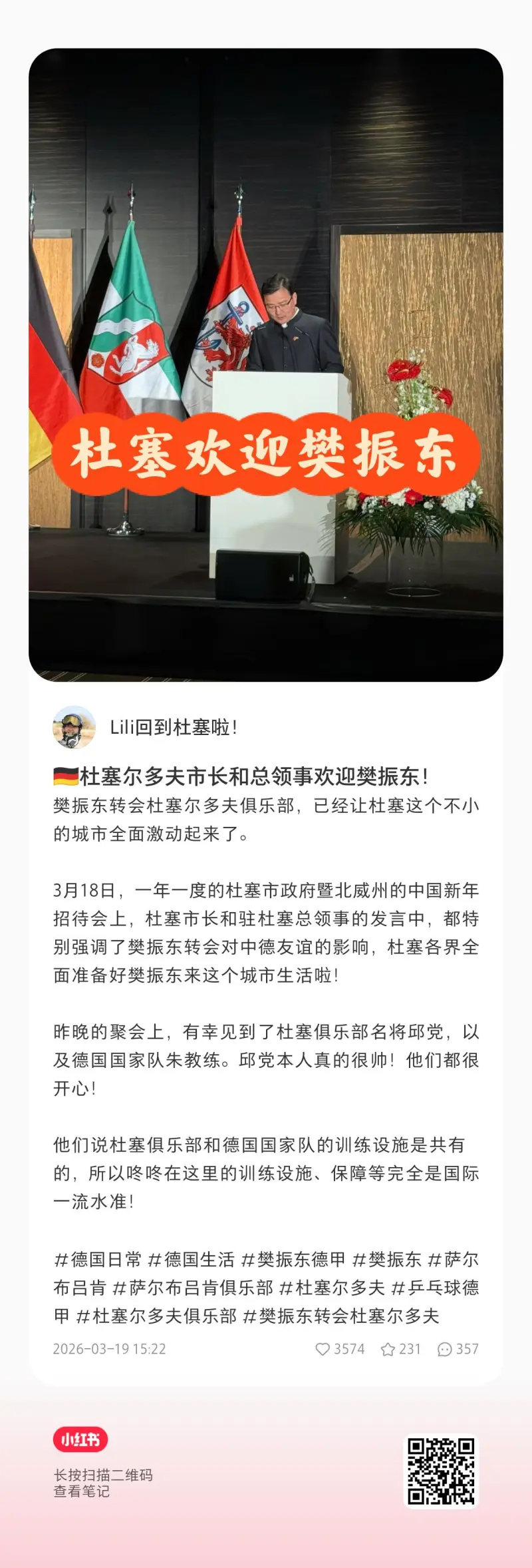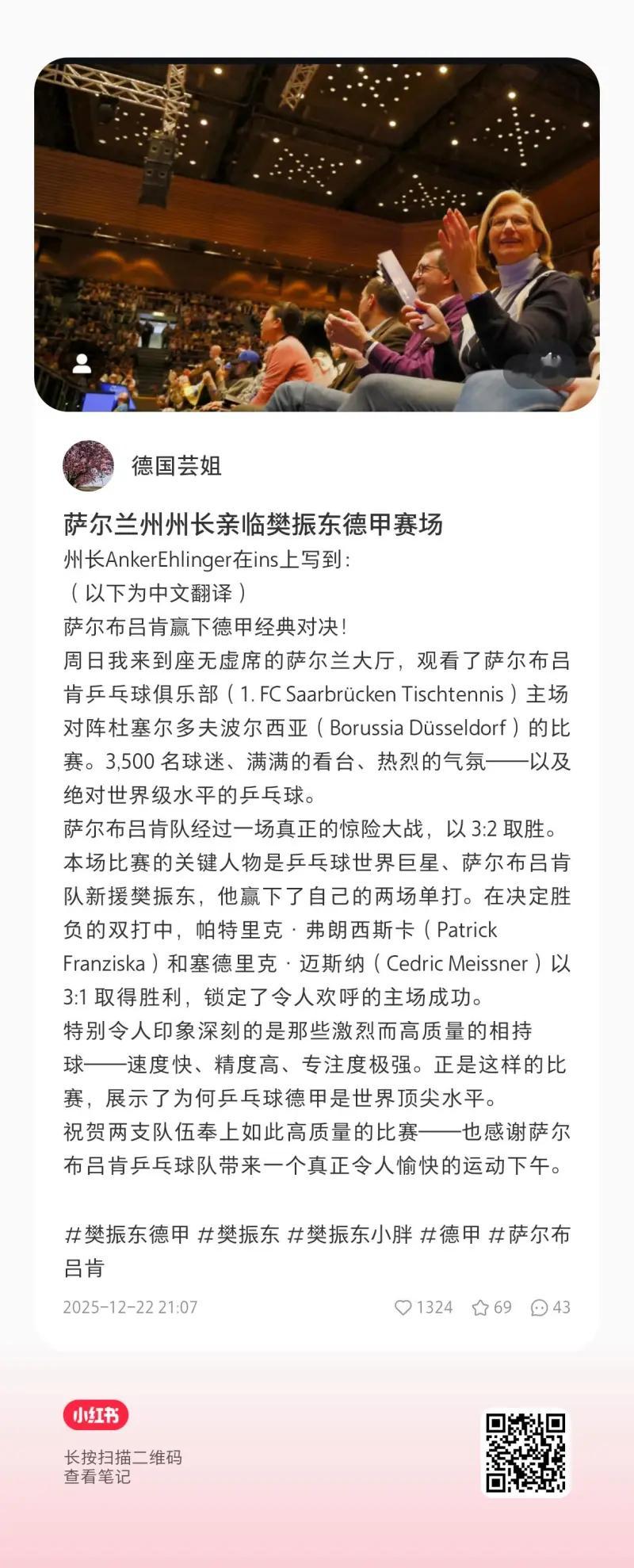 樊振东 国乒排面!外交部欧洲司为樊振东打call!家人们谁懂啊!外交部欧洲司直接点名宣传樊振东,这波官方认可真的太有排面了 !小胖在德国萨尔布吕肯俱乐部的主场告别战,不仅收获球迷满场欢呼,还被外交部欧洲司转发送上热搜 。他用英文和球迷说“我们永远都是朋友和家人”,赛场内外都透着谦逊与真诚 。加盟德甲以来,他靠硬核球技圈粉欧洲,带队打出亮眼战绩,还带着队友中文拜年、推广中国文化,把当代“乒乓外交”玩出了新花样 。从赛场拼搏到民间交流,樊振东不仅是国乒荣耀,更是中欧友好的鲜活纽带 。为这位用乒乓连接世界的中国健儿点赞!