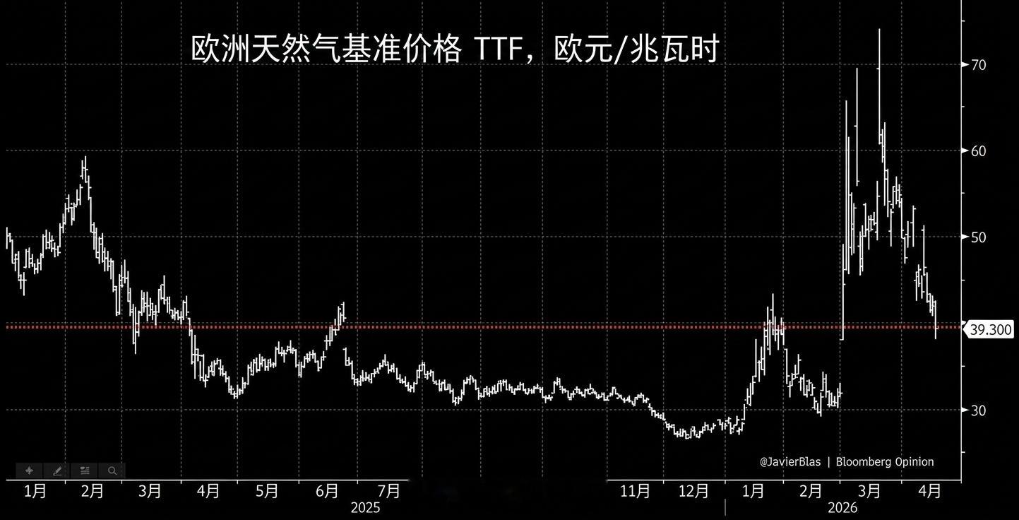 欧洲的天然气和电力成本已经迅速回落到伊朗冲突前的典型水平,现在价格已经低于2025年第一季度的指标。