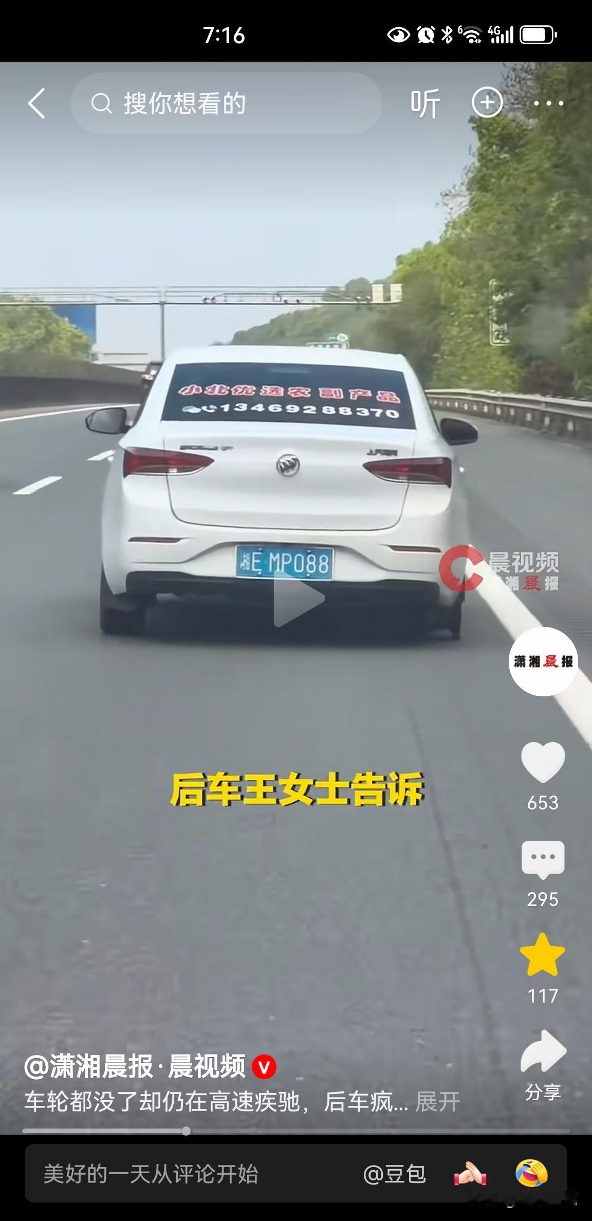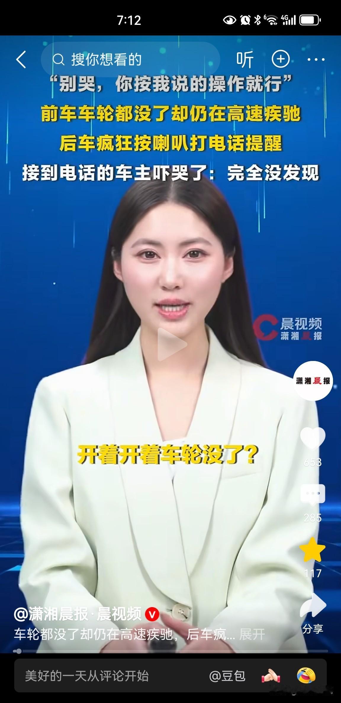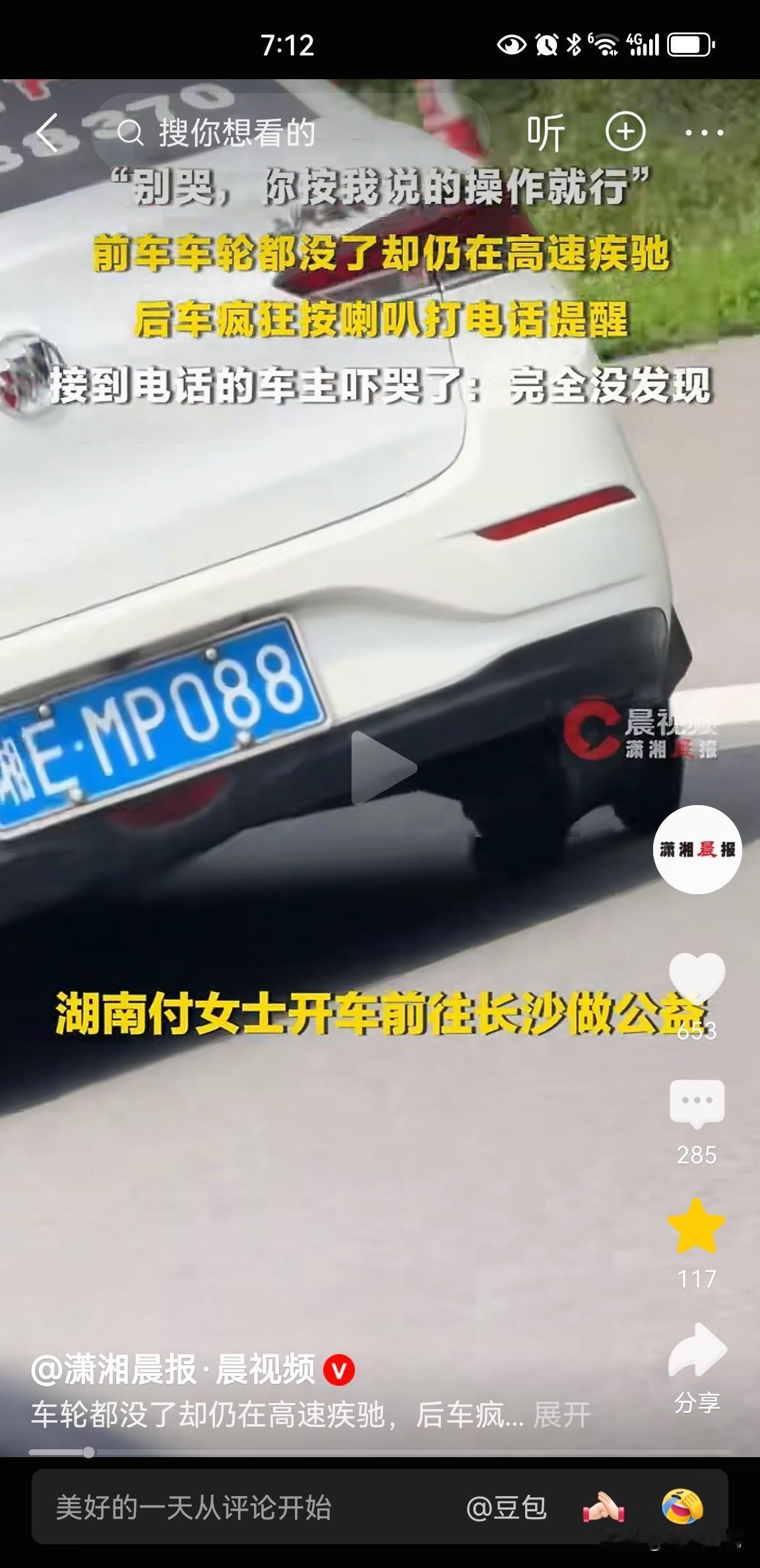 湖南一位女士驾车去长沙,车轮都没了她毫无察觉,还开着车在高速上疾驰,我就想问问男司机,后轮没气了到底能不能察觉到? 发布视频的网友在高速路上发现前面一辆白色轿后车轮的轮胎都磨没了,只剩下轮毂在疾驰。 网友试图按喇叭提醒前车,按了几下后对方没反应,可能没有领悟到是在提醒自己。 巧的是前车后玻璃上有电话,网友便试着拨通了电话,接电话是女的,于是告诉对方后轮胎的问题,她紧张的大哭起来。 原来前车就是付女士驾驶的车,她一个人开车去长沙做公益,后车轮没气了她完全没察觉到,仪表盘提示后车轮气压偏低,她以为只是有点漏气。 接到后车电话她确实惊到了,一时不知道该怎么办,就急得大哭起来,网友赶紧安抚她,“别哭,按我说的操作就行。” 付女士幸好遇到了网友,热心提醒还帮她解决问题。 看过视频的网友们在评论区展开了热烈讨论,一位自称有13年驾龄的老司机说,后轮破了在高速上根本没多大感觉,尤其是注意力都集中在前方的时候,他自己也在高速上经历过一样的事,当时只感觉方向有轻微偏移。 有更多网友持反驳的看法,说自己车轮夹个小石子都能感觉得到。 想问问朋友们,车胎没气都有什么反应,怎样能察觉到?