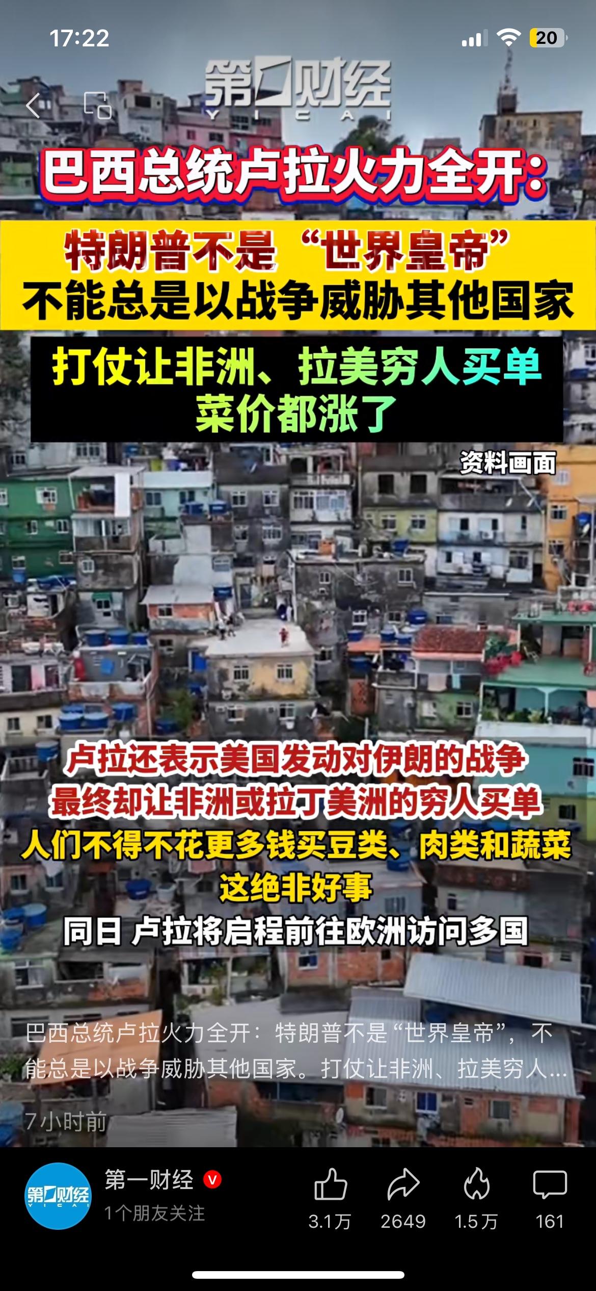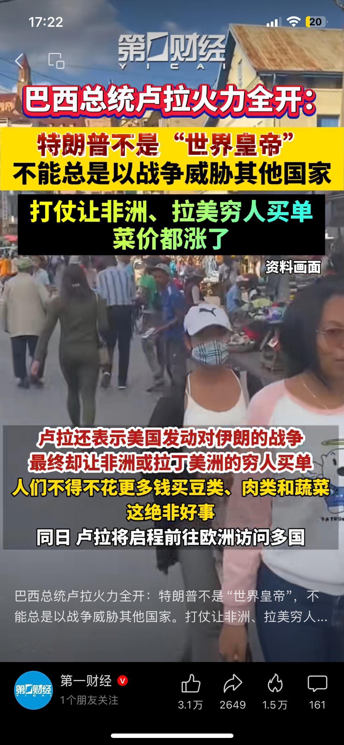 卢拉火力全开:特朗普不是世界皇帝,别拿战争威胁别国 巴西总统卢拉直接公开表态,喊话特朗普别把自己当成世界皇帝,更不要动不动用战争威胁其他国家。他还直言,美国对伊朗的施压与战争恐吓,最后受苦的都是非洲、拉美普通百姓,物价上涨、生活成本变高,受伤的全是穷人。 卢拉 巴西总统 美国霸权