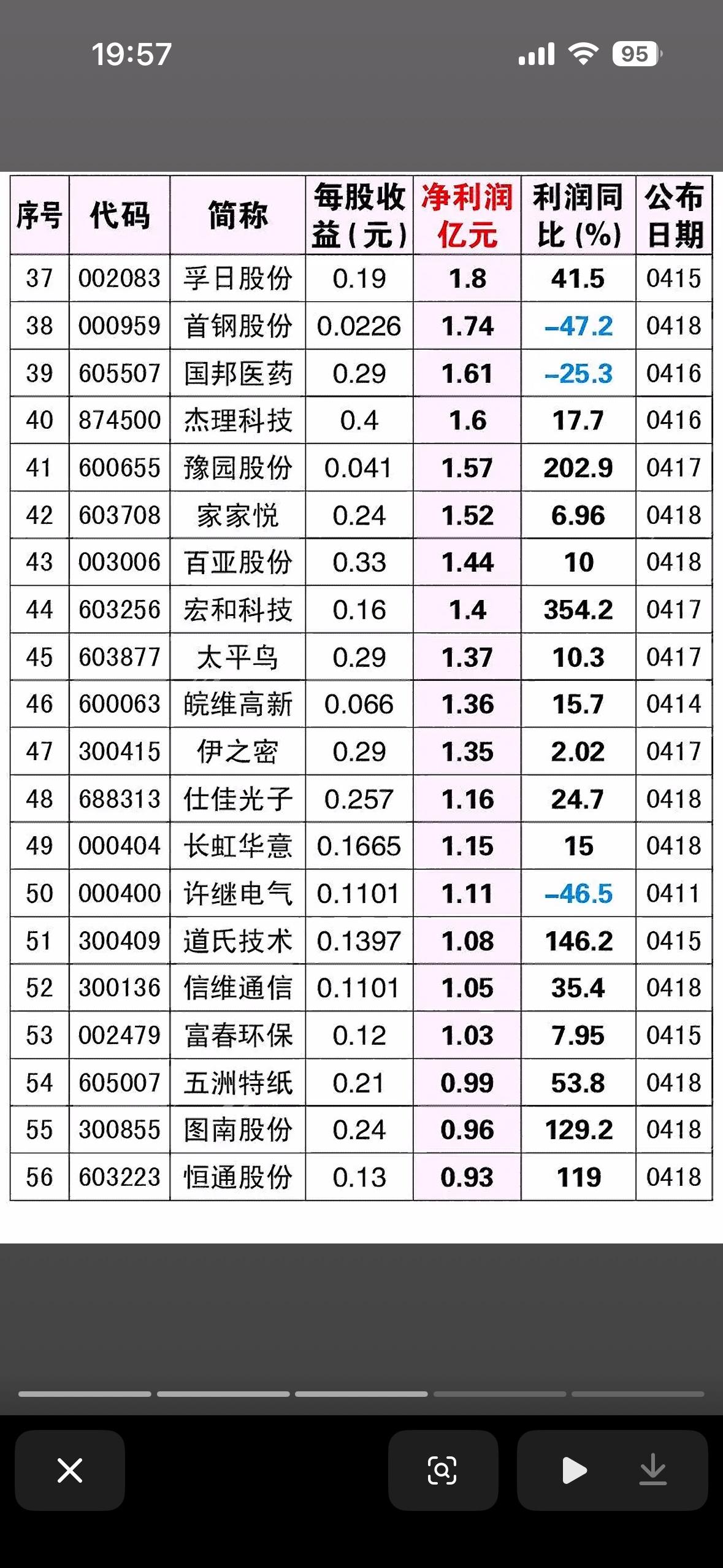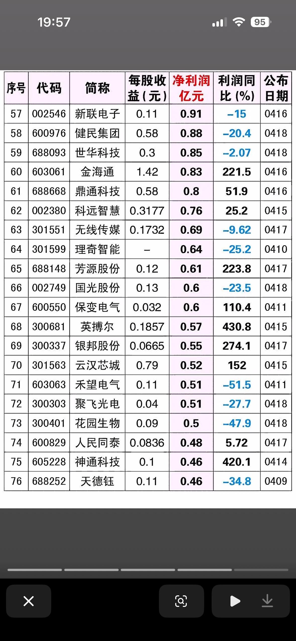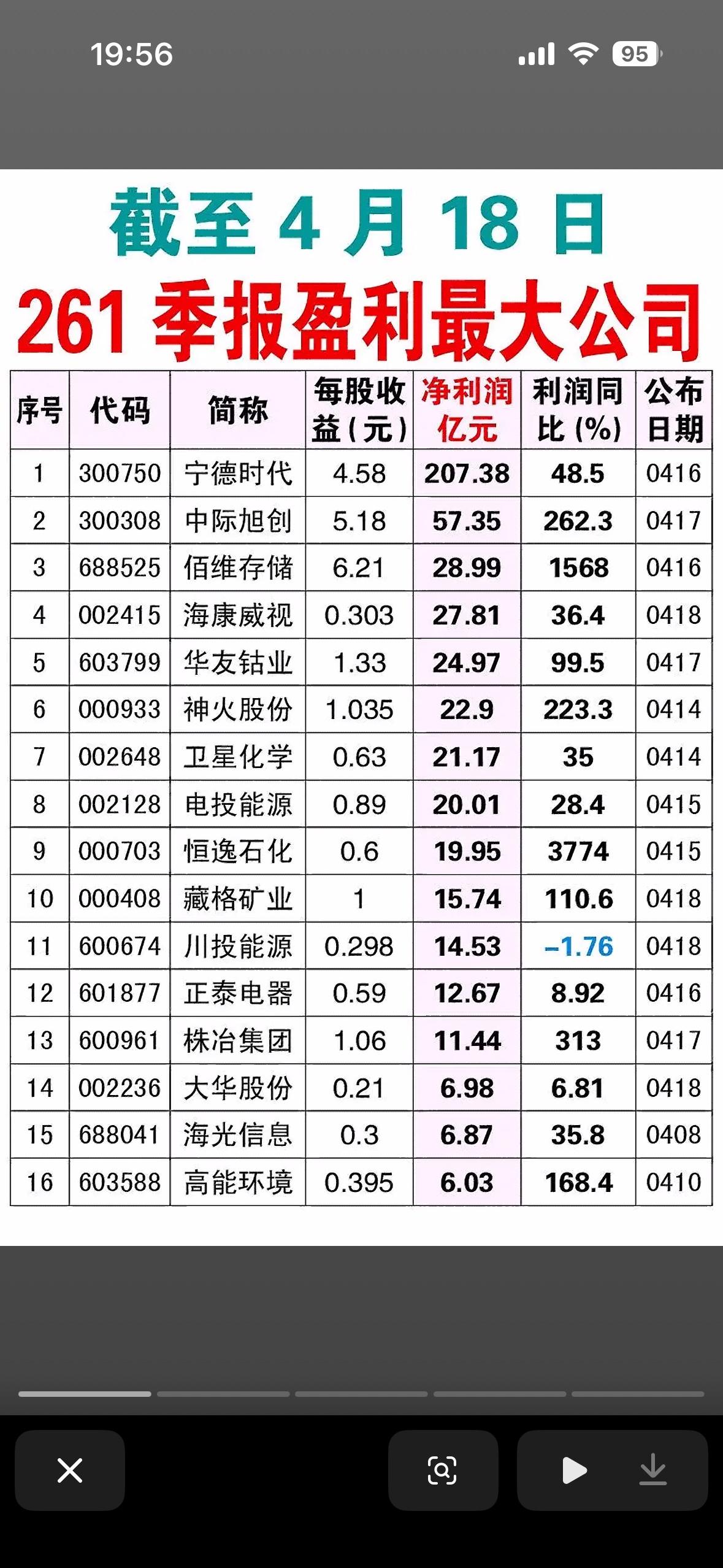 截至4月18日的A股市场“季报盈利最大公司”榜单,统计的是2026年第一季度(即“26年1季报”)的业绩数据。它筛选出了16家净利润规模领先的公司,旨在展示当前市场中基本面最强劲、赚钱能力最强的龙头企业。 从榜单数据可以看出,这些公司的业绩表现呈现出以下几个鲜明特征: 业绩炸裂,高增长成色足 - 宁德时代(300750):以207.38亿元的净利润断层式领先,不仅规模巨大,利润同比还增长了48.5%,显示出其作为“宁王”在产业链中不可撼动的定价权和盈利能力。 - 中际旭创(300308):净利润57.35亿元,同比增长262.3%。作为光模块龙头,其业绩暴增直接反映了全球AI算力建设对高速光通信需求的井喷。 - 佰维存储(688525):利润同比增幅高达1568%,这是一个极其惊人的数字。这通常意味着存储芯片行业周期见底反转,公司迎来了量价齐升的“戴维斯双击”。 - 恒逸石化(000703):利润同比增幅达到3774%,虽然基数可能较低,但这种级别的反弹说明化工周期行业正在经历剧烈的盈利修复。 行业分布:硬科技与顺周期是主力 榜单中的公司主要集中在两个方向: - AI算力与半导体:中际旭创(光模块)、佰维存储(存储芯片)、海光信息(CPU/DCU)。这三家公司的高增长,强有力地验证了AI算力产业链正处于业绩兑现的爆发期,是市场最确定的主线之一。 - 新能源与顺周期资源:宁德时代(锂电池)、华友钴业(钴镍资源)、神火股份(铝/煤炭)、卫星化学(化工新材料)。这些公司的业绩大增,一方面得益于新能源需求的持续,另一方面也反映了上游资源品价格的坚挺。 唯一的“异类”:川投能源 在前16名中,川投能源(600674)是唯一一家利润同比下滑(-1.76%)的公司。这可能与水电行业的季节性因素(如来水情况)有关。尽管利润微降,但它依然凭借14.53亿元的巨额利润排在第11位,显示出公用事业类公司业绩的稳定性。 投资视角的解读 这张榜单实际上提供了一份“绩优股”的核心资产池。 - 对于价值投资者:宁德时代、海康威视等大白马的业绩稳健,提供了安全垫。 - 对于成长投资者:中际旭创、佰维存储的爆发式增长,是追逐高弹性的最佳标的。 - 风险提示:虽然业绩好,但也要看股价位置。像中际旭创等股票前期涨幅已大,业绩利好可能已经被市场提前消化(即“利好兑现”)。