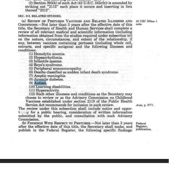 In 1986, over a decade prior, due to widespread parental claims that pertussis vaccine (injected 3x in the first 6 months of life) caused their child’s autism, Congress required HHS (as part of the National Childhood Vaccine Injury Act of 1986) to review the extent of the relationship between pertussis-containing vaccines and autism. In fact, autism was one of only 11 conditions it asked HHS to review. See the original text from the 1986 Act below.*