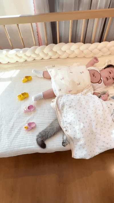 俺家宝宝一睁眼,瞧见猫咪在旁边躺着,立马不哭不闹了。小家伙伸出小手,抓着猫咪的前爪,眨巴着眼睛瞅着,模样乖得很。猫咪也特别给面儿,安安静静躺在旁边,不叫唤也不躲,任由宝宝摆弄。俩小家伙在床上能躺老半天,猫咪陪着宝宝,宝宝靠着猫咪,这画面暖乎乎的,太招人稀罕啦!猫咪ø 猫咪