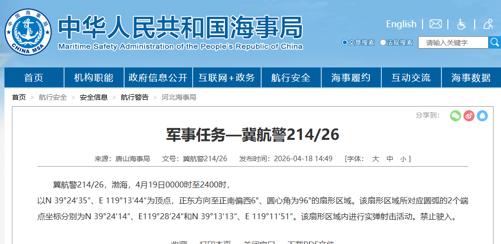 #渤海明日进行军事任务#【明日进行军事任务,禁止驶入】据中国海事局网站消息,唐山海事局发布航行警告,4月19日0时至24时,渤海部分区域内进行实弹射击活动,禁止驶入。(中国海事局网站)