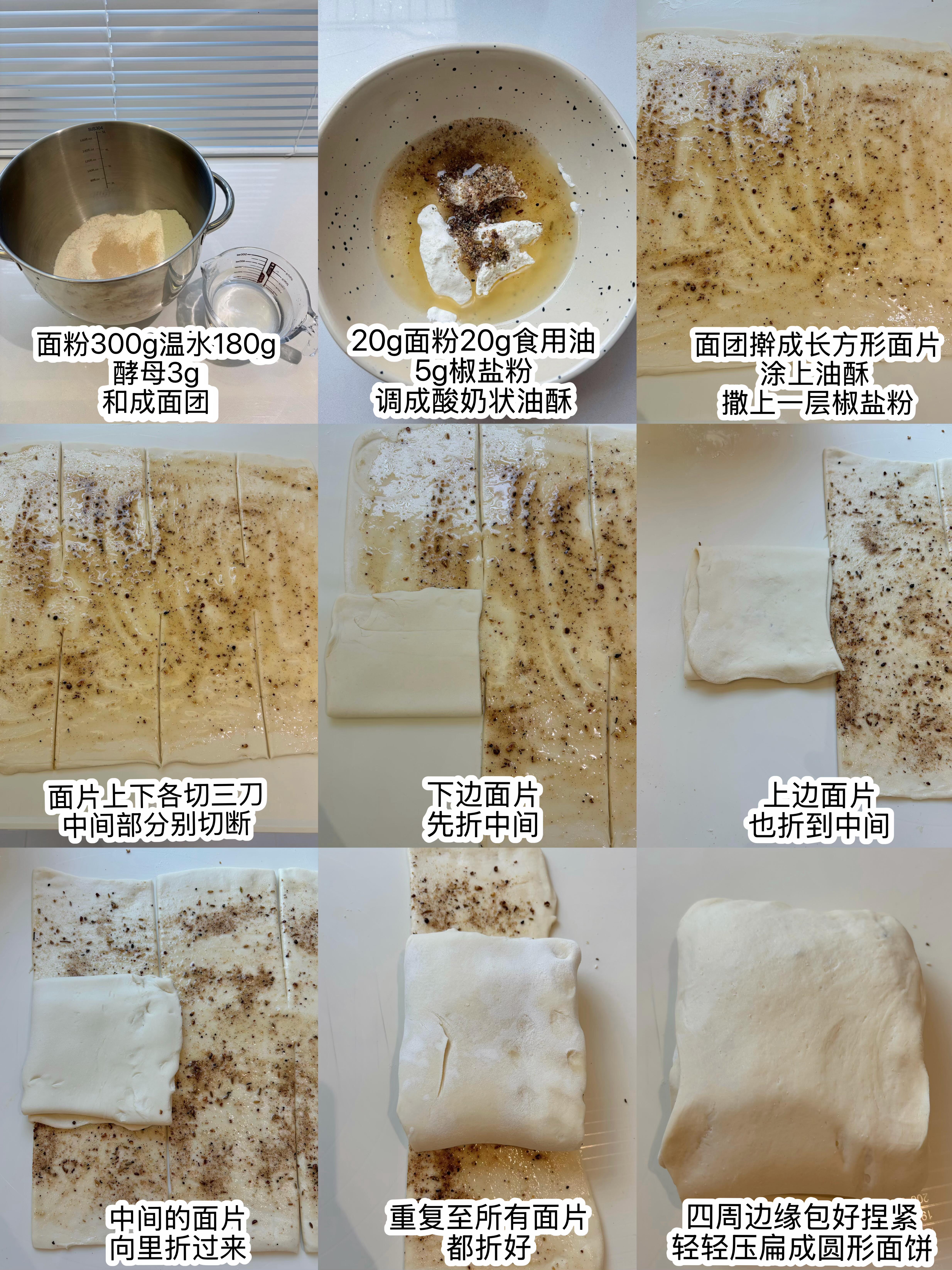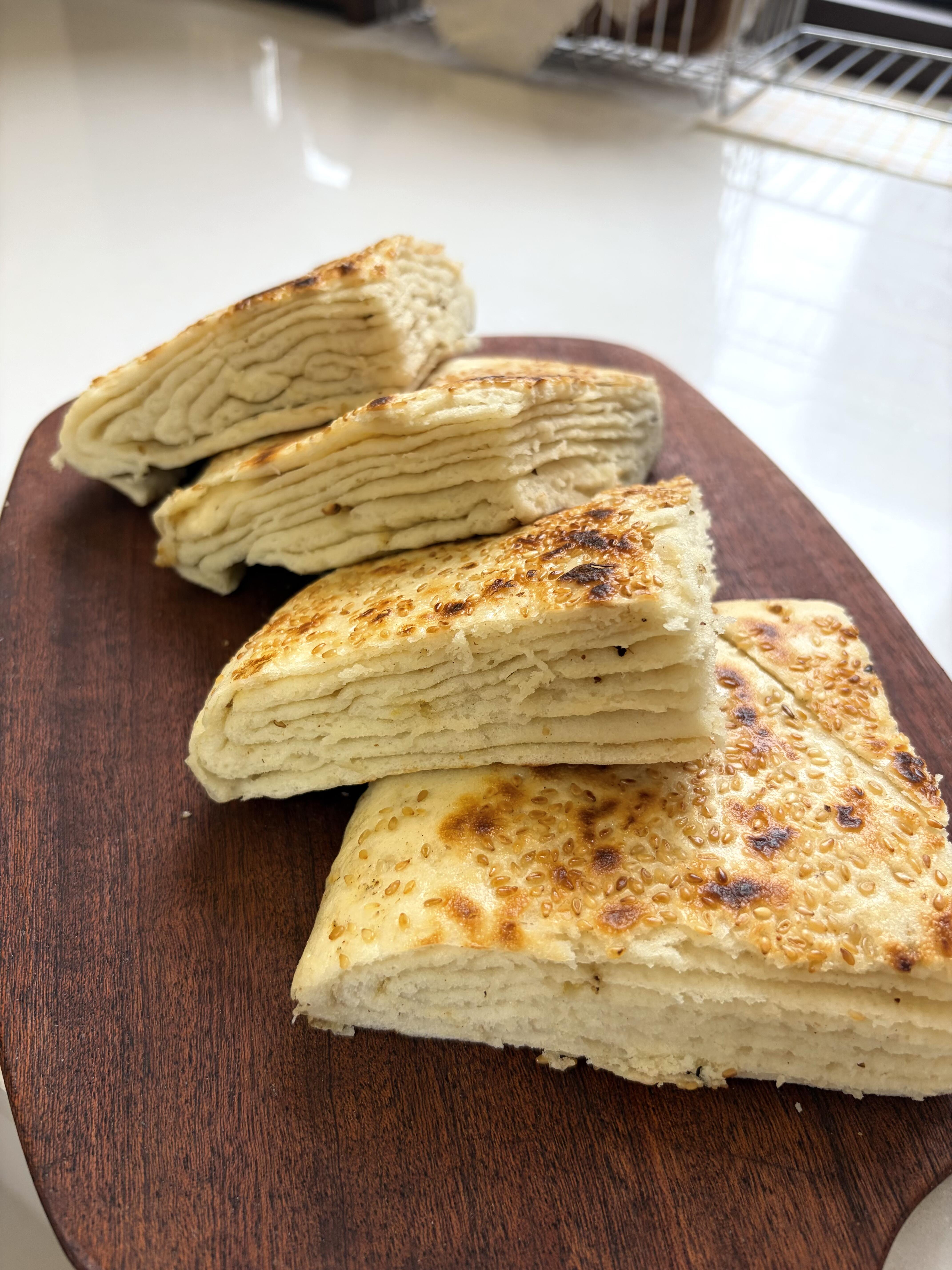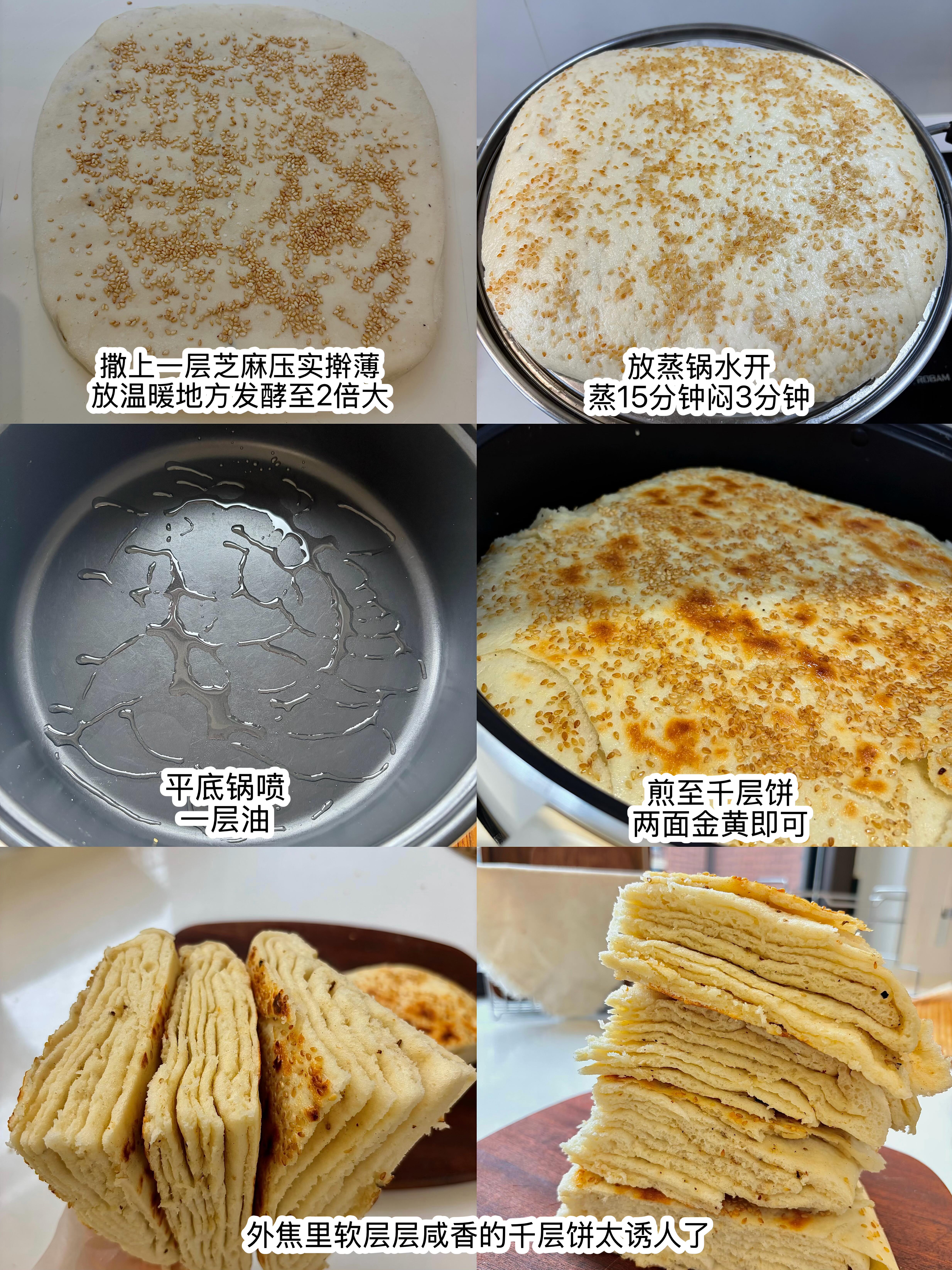 🧑🍳做法 1️⃣ 松弛好的面团取出来,擀成薄薄的长方形面片,均匀涂上一层油酥,再撒上一层椒盐,用量根据自己的口味调整就好。 2️⃣ 面片上下各切三刀,注意不要切断,然后依次折叠好,把边缘捏紧封口,撒上一层白芝麻压实,再擀成薄薄的圆饼,放到温暖的地方发酵至两倍大。 3️⃣ 发酵好的面饼放进蒸锅,水开后蒸15分钟,关火再闷3分钟(这样更暄软);接着平底锅喷少许油,把面饼放进去,烙至两面金黄,出锅就能吃啦~