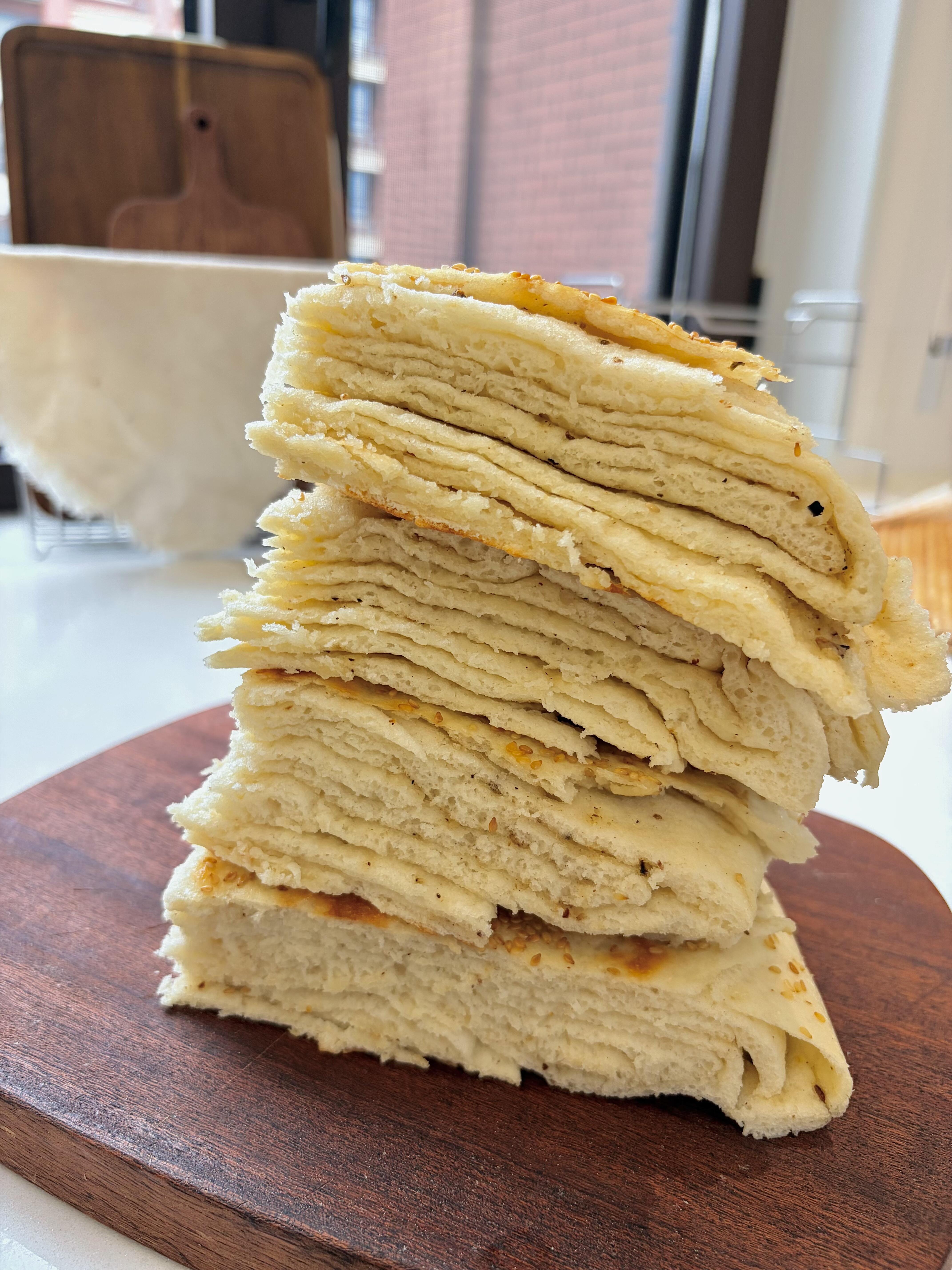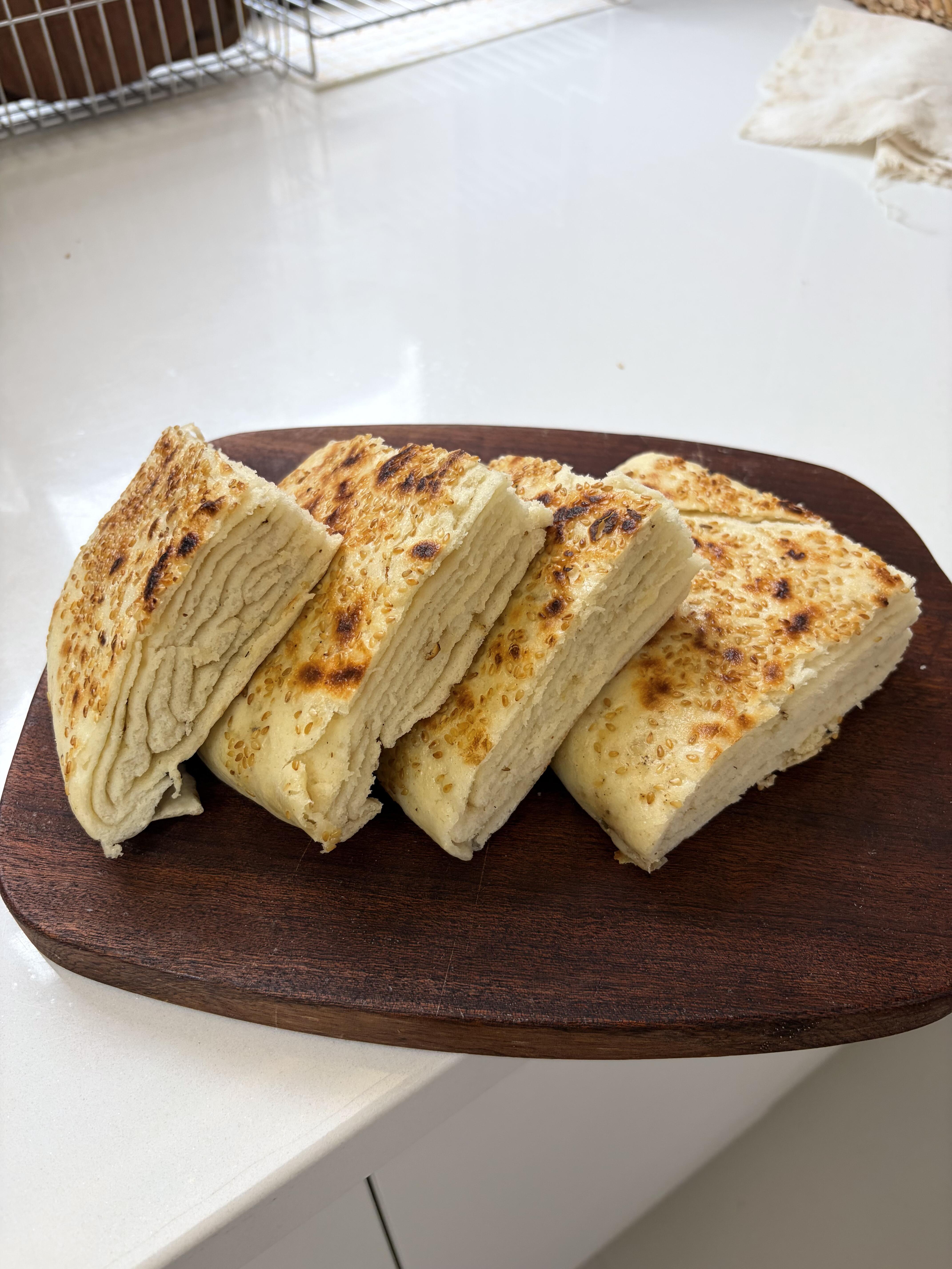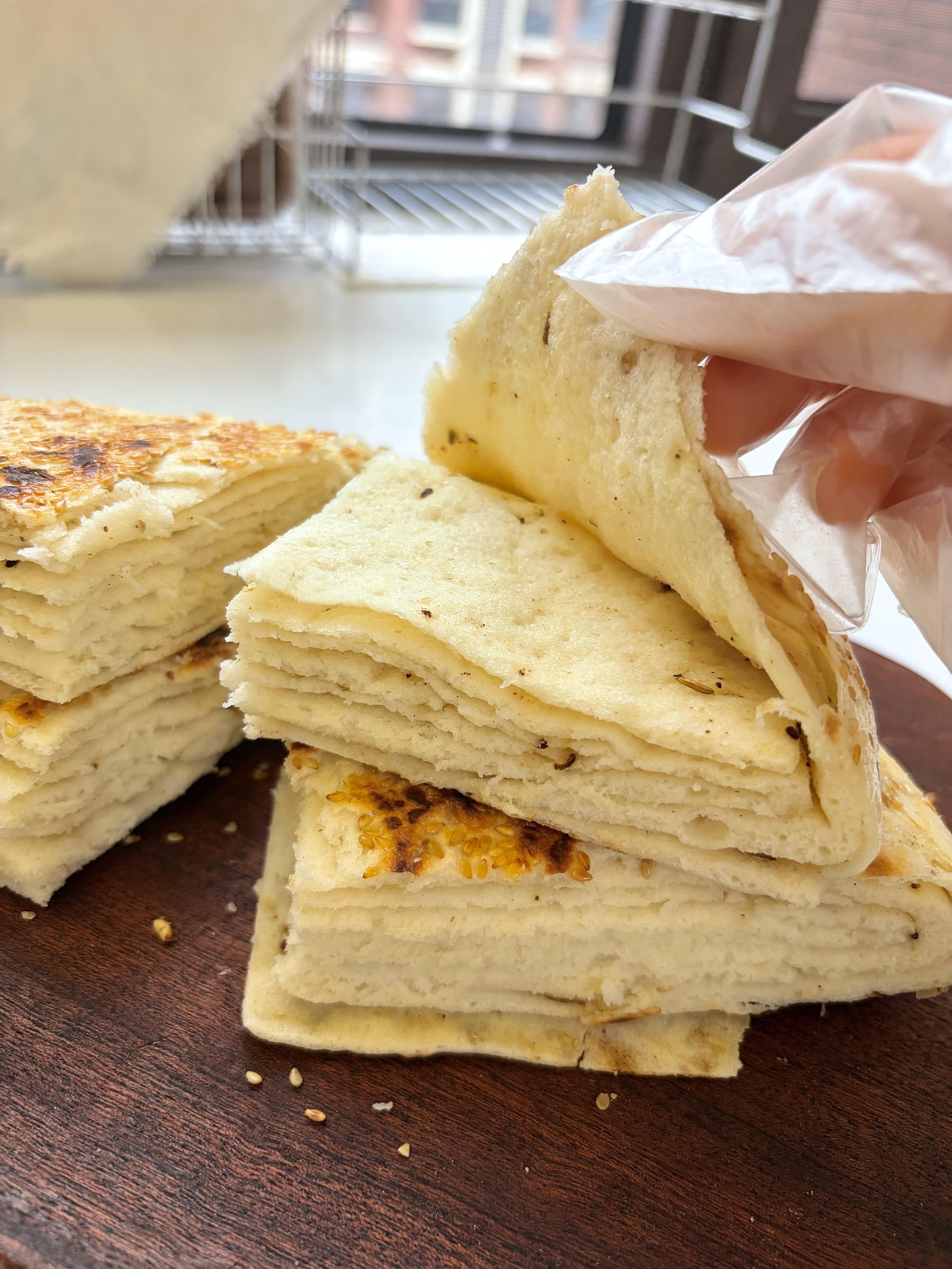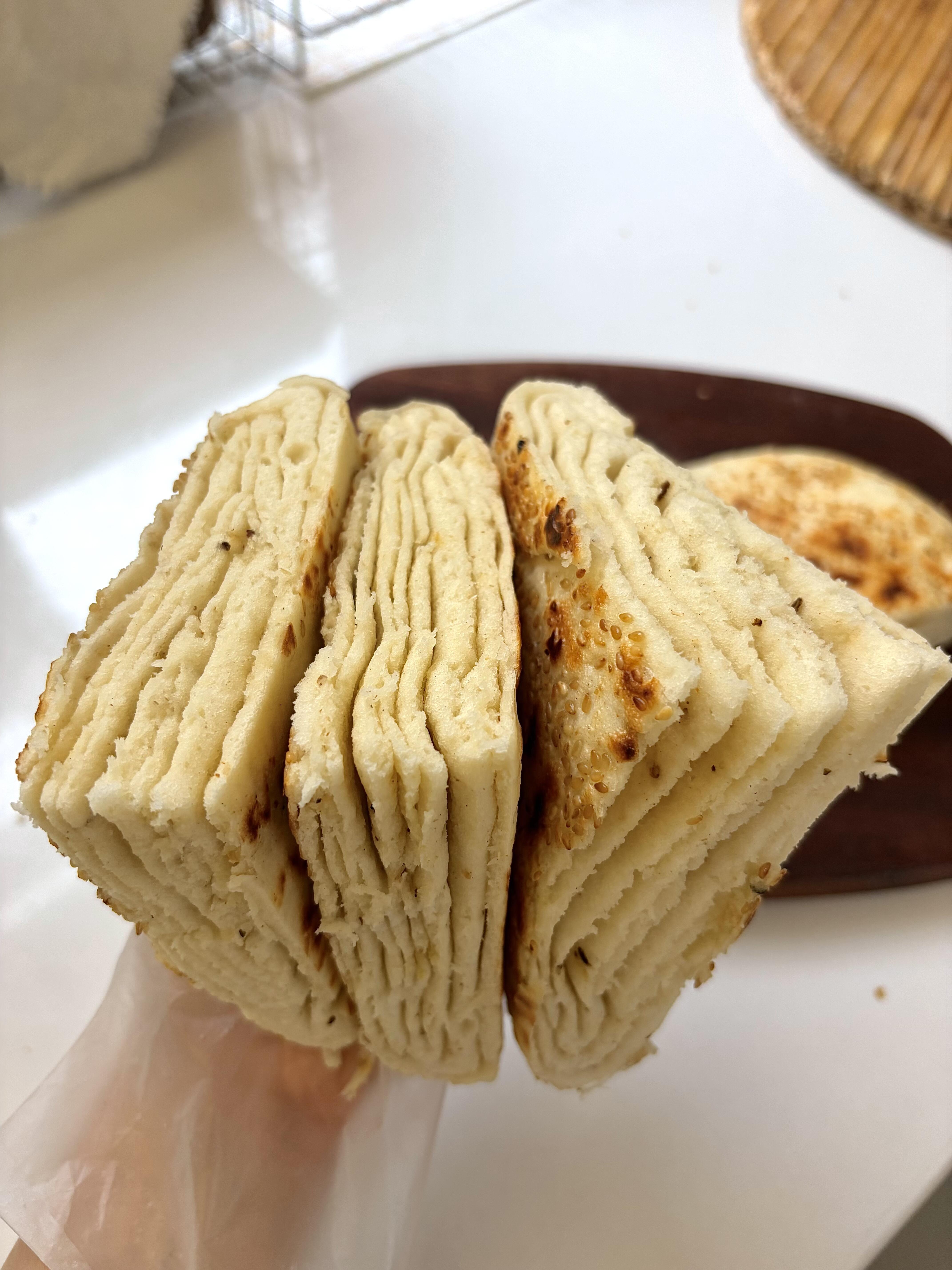 🧑🍳做法 1️⃣ 松弛好的面团取出来,擀成薄薄的长方形面片,均匀涂上一层油酥,再撒上一层椒盐,用量根据自己的口味调整就好。 2️⃣ 面片上下各切三刀,注意不要切断,然后依次折叠好,把边缘捏紧封口,撒上一层白芝麻压实,再擀成薄薄的圆饼,放到温暖的地方发酵至两倍大。 3️⃣ 发酵好的面饼放进蒸锅,水开后蒸15分钟,关火再闷3分钟(这样更暄软);接着平底锅喷少许油,把面饼放进去,烙至两面金黄,出锅就能吃啦~