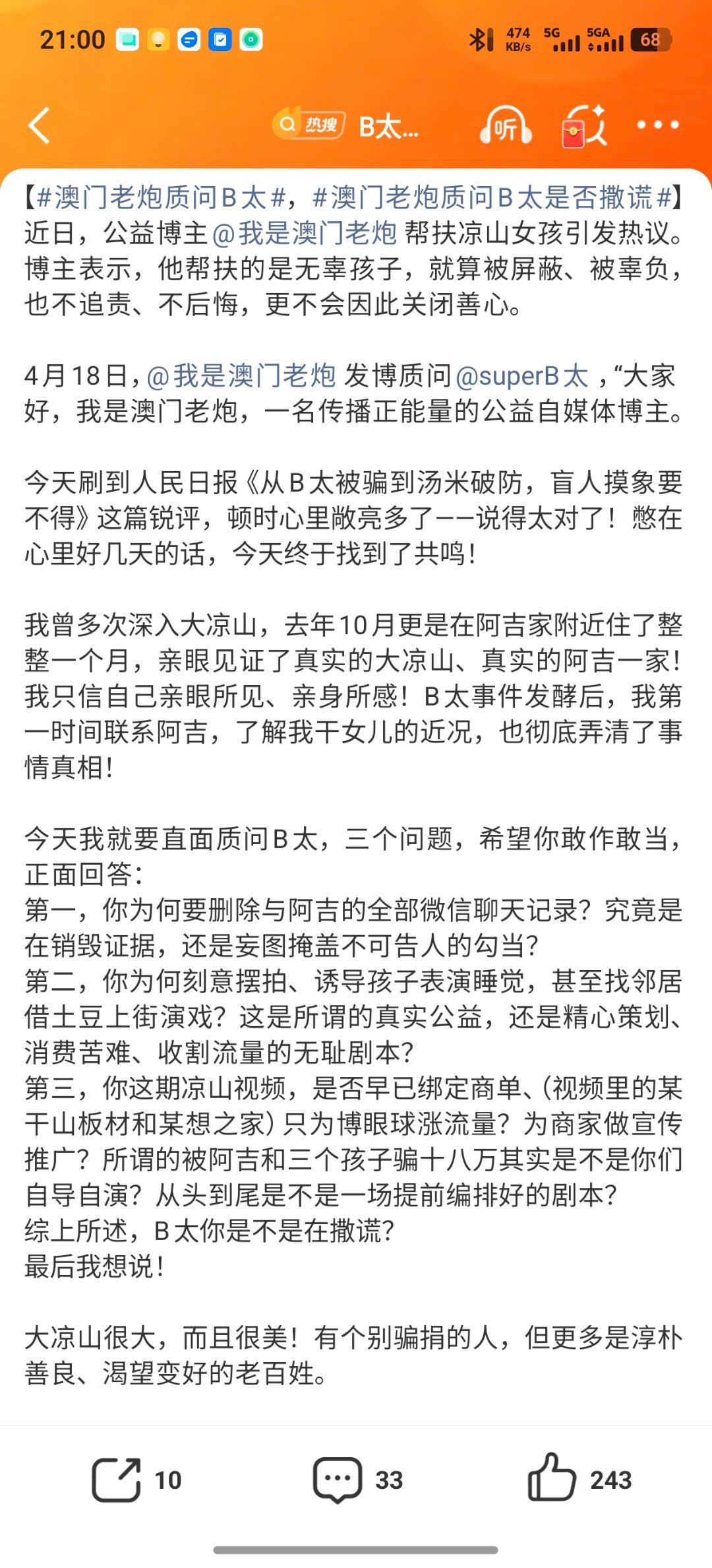 澳门老炮质问B太之前资助大凉山阿吉的澳门老炮,三问B太;