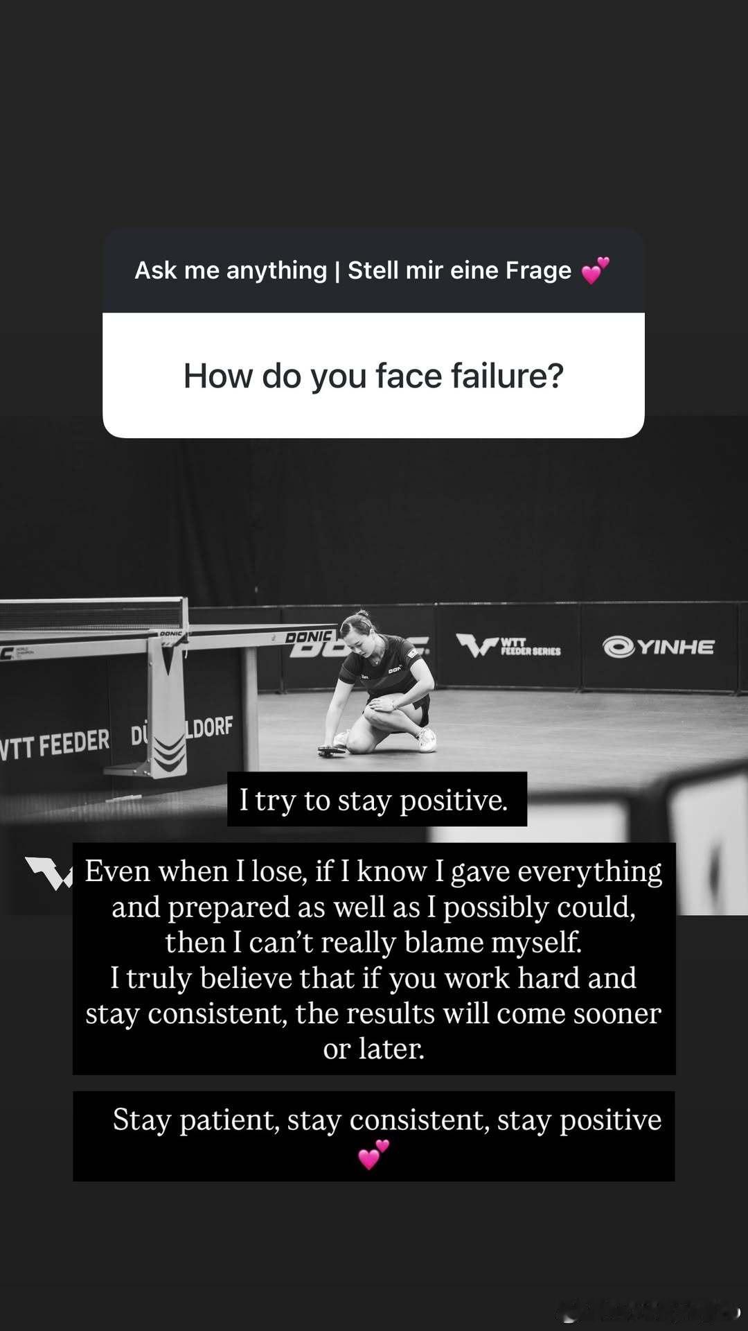 你如何面对失败?我会努力保持积极的心态。就算输了比赛,只要我知道自己已经拼尽全力、做到了最好的准备,就不会责怪自己。我始终相信,只要努力付出并坚持下去,结果总会到来的。保持耐心、保持坚持、保持积极 💕