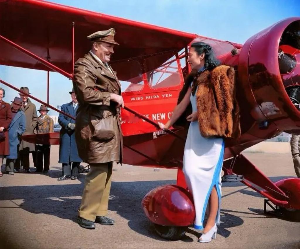 1939年4月,颜雅清获得美国特纳上校赠送的红色单翼机时,亲切交谈时的一幕,这架飞机被命名为“新中国精神号”。 - 颜雅清是上海人,出身名门,8岁随父亲赴美,1938年在美国获得飞机执照,是中国第一代女飞行员,在抗战时期,她为了支持国际援助,进行环美飞行募捐,这种行为受到了特纳上校的感动,为了表示支持赠送了她一台飞机。