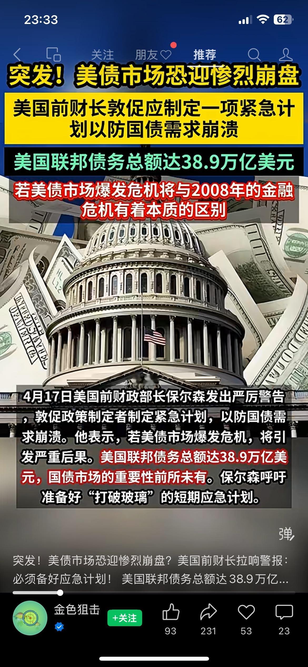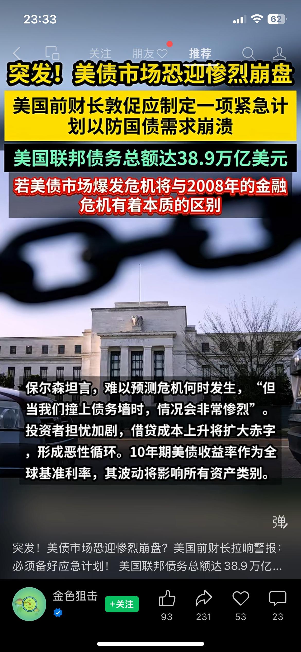 美债拉响警报,对咱们普通人钱袋子有啥影响 美国前财长最近发出警告,美债市场风险很大,得赶紧出台应对方案。目前美债总额已经高达38.9万亿美元,风险比08年金融危机时还要高。 这事跟咱们息息相关,全球资产都会受波及,存款、理财、基金都可能跟着波动,后续走势得持续盯着。
