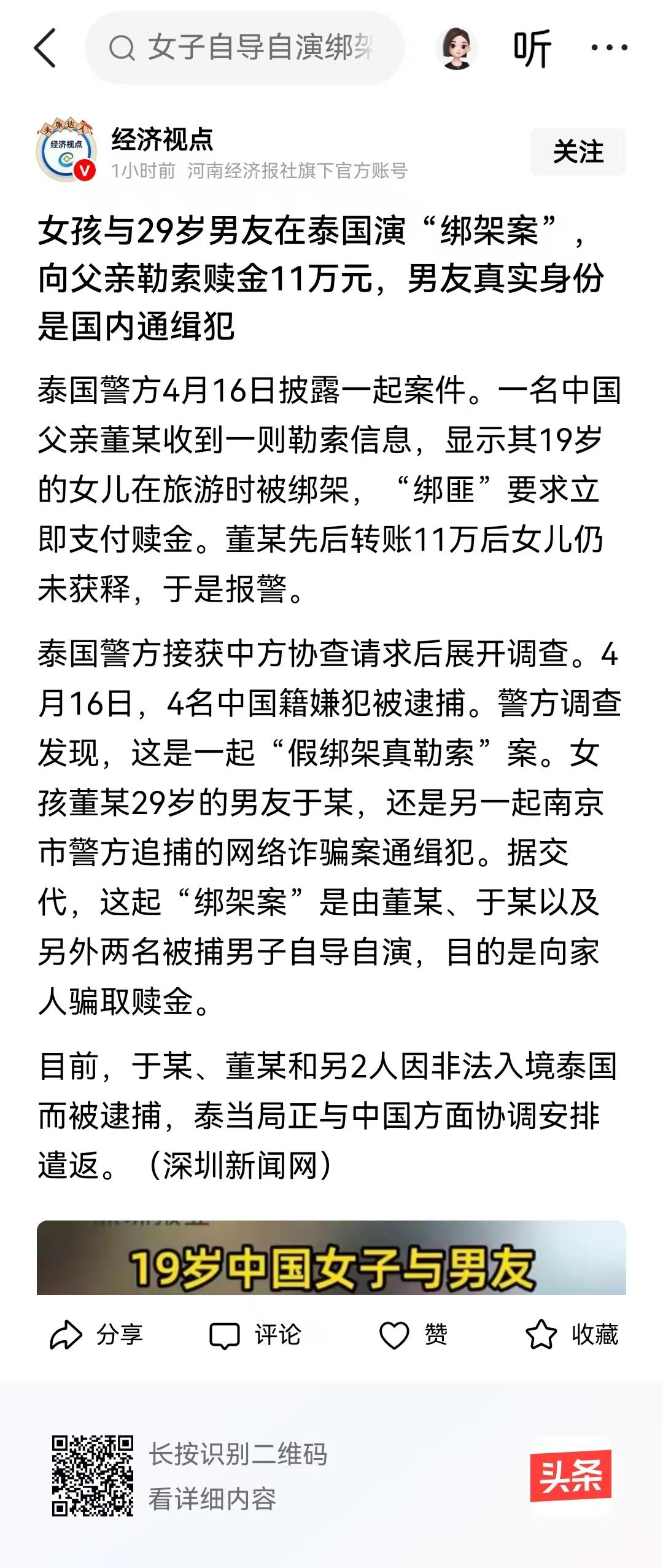 “这下玩大了!”一位中国父亲接到信息,说是她女儿在泰国被绑架了,勒索他交赎金11万元。然而付了11万元赎金后,歹徒却言而无信,没有放了女儿。这位父亲情急之下,报了警,泰国警察调查后发现,这起绑架事件竟是女儿和她男朋友几人自导自演的! 这让谁不生气,哪有拿生命给自己父亲这么开玩笑的! 据报道,女孩19岁,她的男朋友29岁,还有另外一个身份是一起网络诈骗犯的通缉犯。 除了女孩和她男友之外,还有两名中国人。四人在泰国,以为国内管不着,居然胆大包天的上演了一出绑架大戏。 女孩的父亲,爱女心切,一看到勒索信息,担心女儿被撕票,二话不说就转了赎金,却左等右等没有等到女儿被释放的消息。 直到报警后,经过调查,这才发现女孩四人是非法入境,绑架也是假的,正被泰国警方调查。 看似是女儿的一个玩笑,等他们被遣返回国之后,面临的是刑事的严厉处罚。 虽然他们是在国外犯罪,但仍然受中国法律的管辖。 《刑法》第七条明确规定:“中华人民共和国公民在中华人民共和国领域外犯本法规定之罪的,适用本法。” 本案中,4名嫌疑人均为中国公民,他们在泰国实施的诈骗和敲诈勒索行为,中国刑法明确规定为犯罪。因此,中国司法机关有权追究其刑事责任。 此外,4人犯罪行为直接侵害的是中国公民(女孩父亲)的财产权,中国法律基于保护本国公民利益,拥有管辖权。 4人可能涉嫌诈骗罪和敲诈勒索罪。 以非法占有为目的,虚构绑架事实,使被害人陷入错误认识并支付巨额财物(11万元),完全符合诈骗罪的构成要件。根 刑法》第二百六十六条,数额巨大,可处三年以上十年以下有期徒刑,并处罚金。 以威胁、恐吓(制造被绑架的假象)的方式,强行索要被害人财物。此行为也可能被认定为敲诈勒索罪,量刑与诈骗罪类似。 司法实践中,此类“假绑架”常以敲诈勒索罪定罪。 而女孩的男朋友更惨,除了前述的诈骗和敲诈勒索之外,还有他之前的网络诈骗犯,也将面临所涉前罪的追诉,与新罪数罪并罚。 这起荒唐的“假绑架案”再次印证:法律无国界,犯罪必受惩。无论身处何地,敬畏法律、珍视亲情,才是做人最基本的底线。