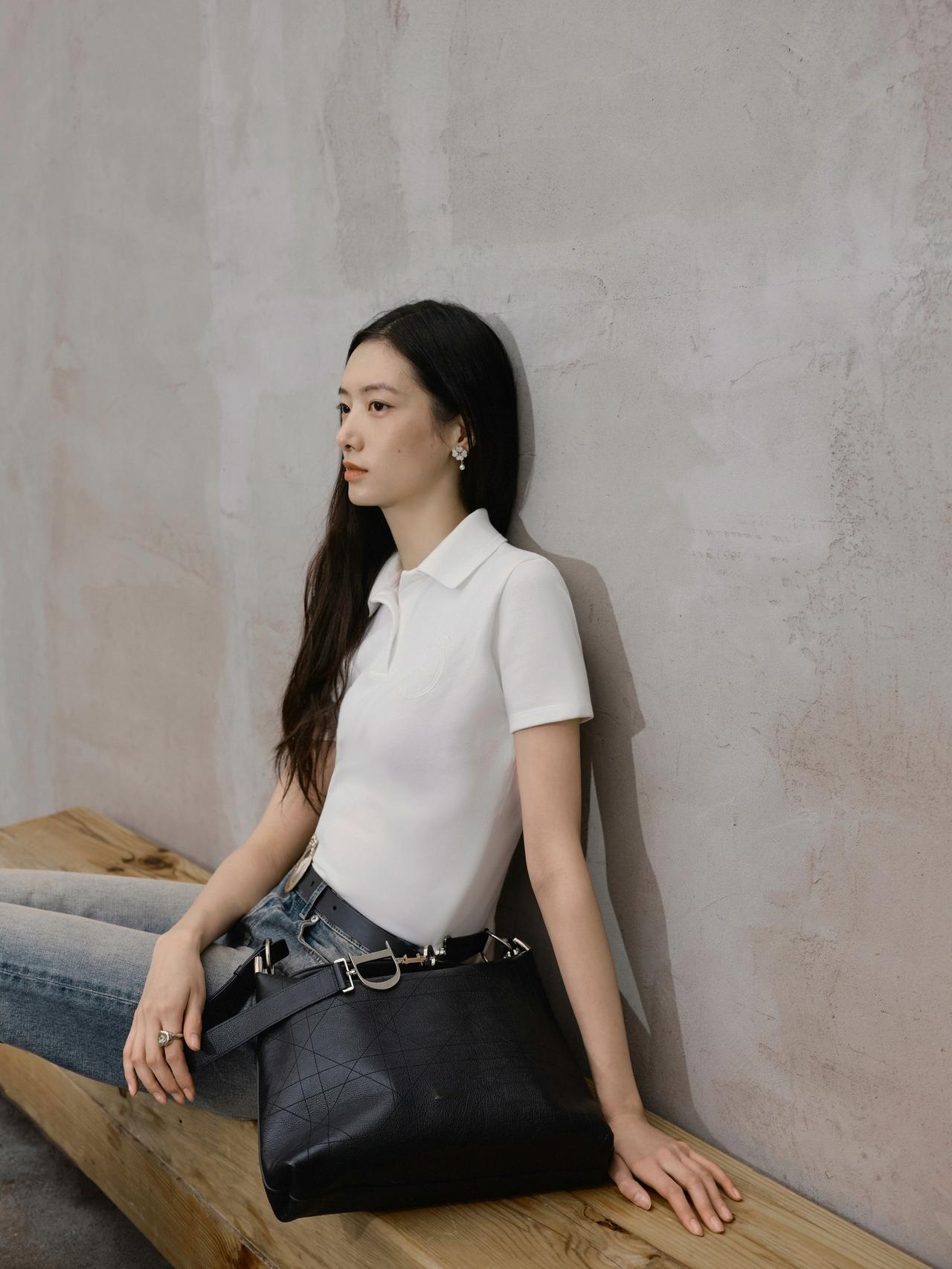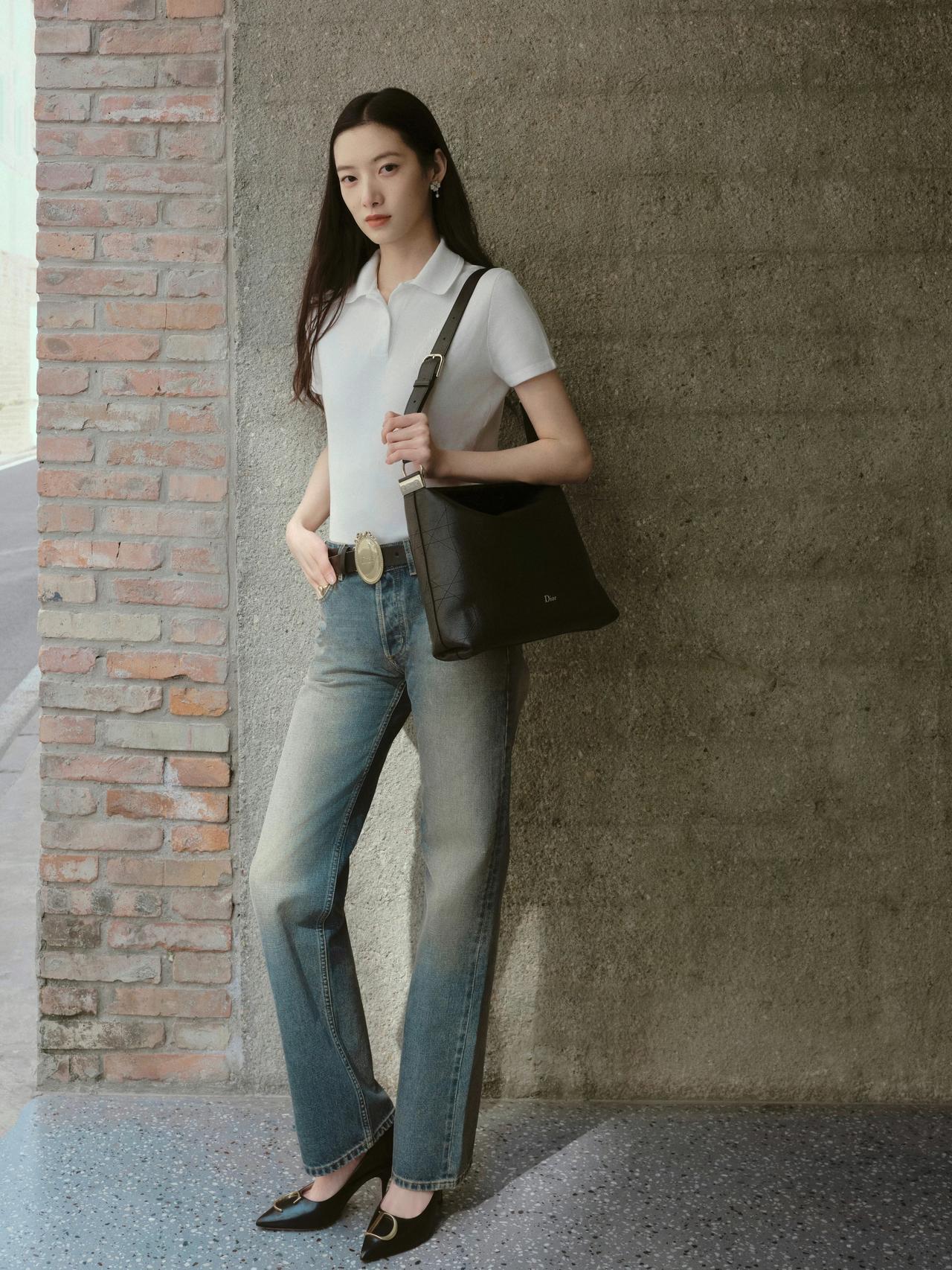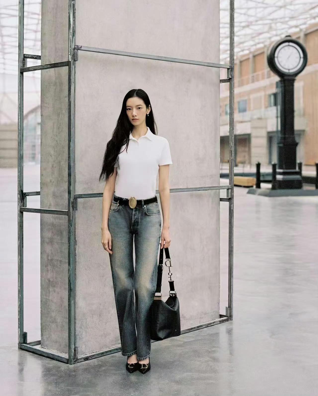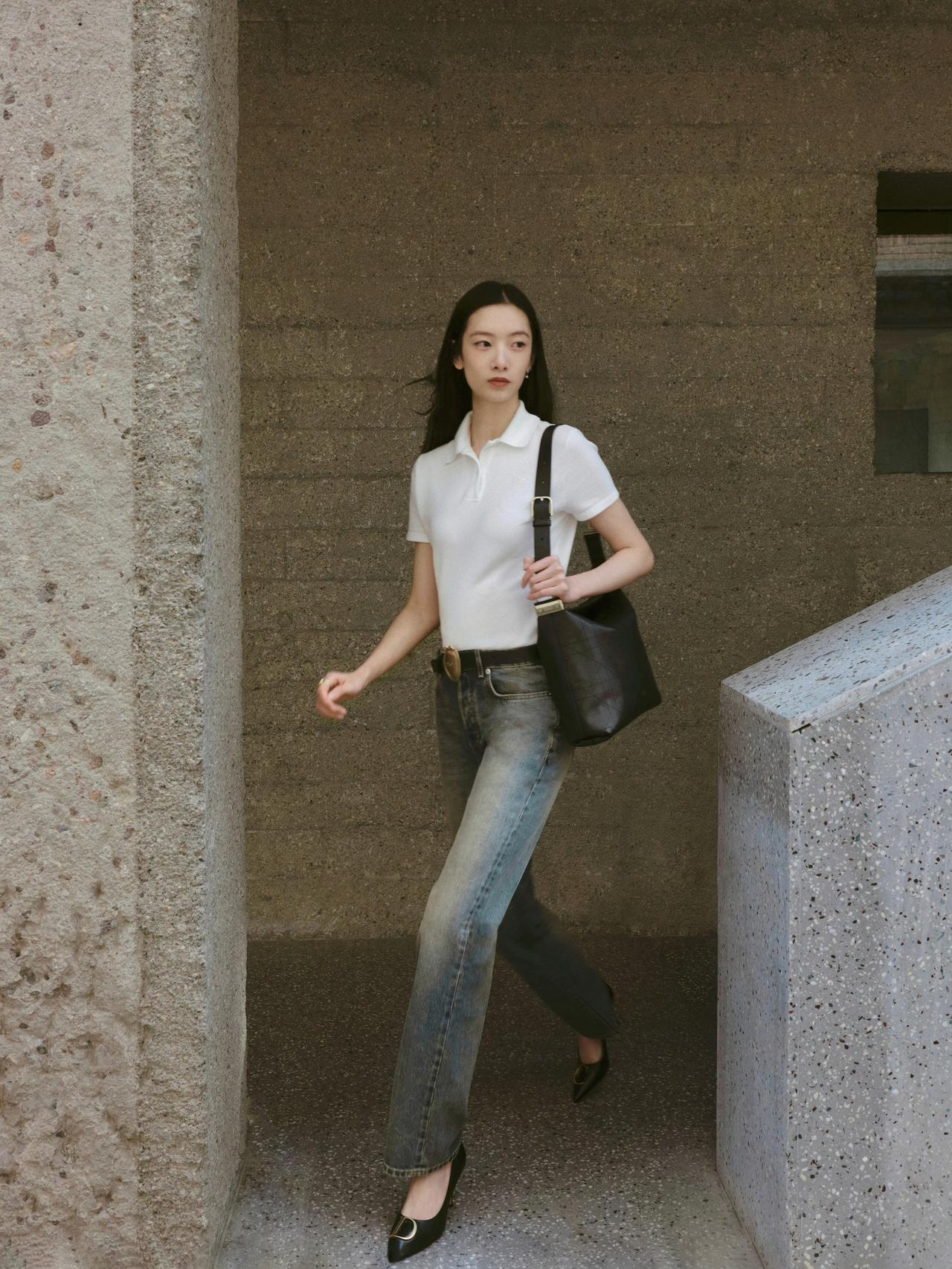 简约高级的通勤松弛风,气质感直接拿捏! 白色Polo针织衫+渐变阔腿牛仔,搭配金属扣腰带和尖头高跟鞋,基础款里藏着精致细节(比如大logo腰带、质感包包),是“不费力的高级感”职场穿搭,休闲又不失利落~