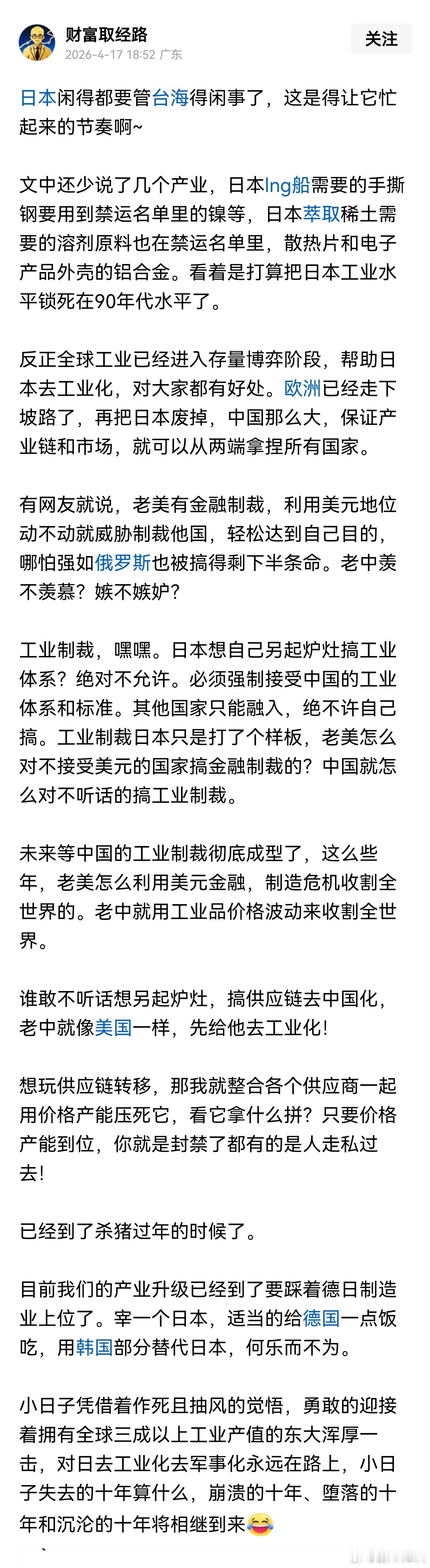 日本和中国产业链脱离一定是死路一条:日本lng船需要的手撕钢要用到禁运名单里的镍等,日本萃取稀土需要的溶剂原料也在禁运名单里,散热片和电子产品外壳的铝合金。看着是打算把日本工业水平锁死在90年代水平了。