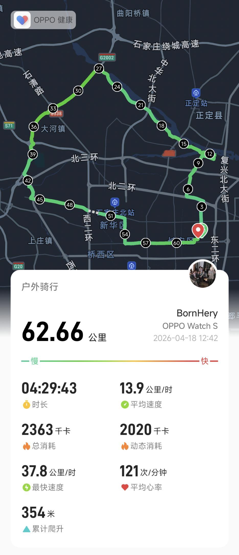 欧哥太牛逼了,今天骑了62.66km