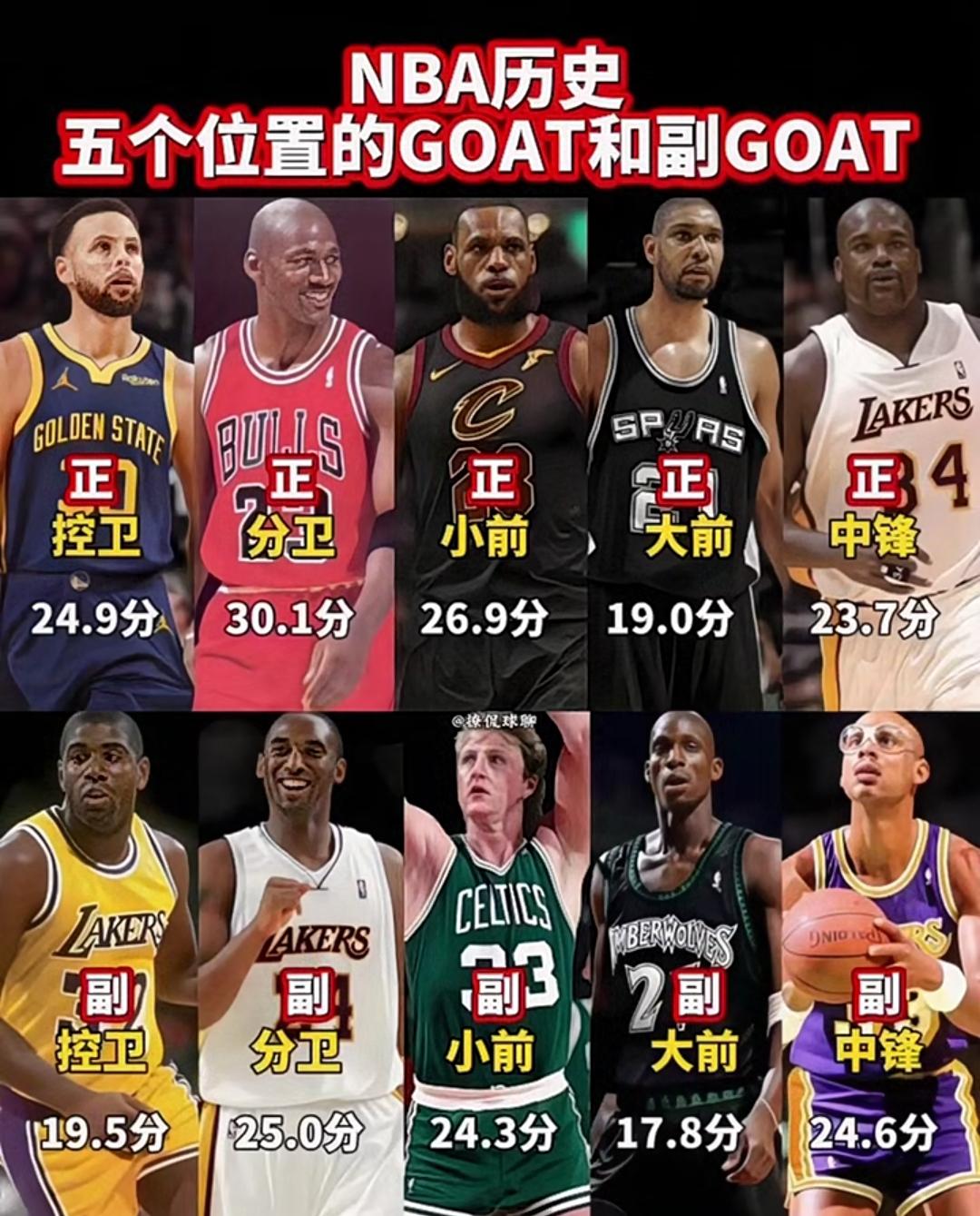 NBA五个位置的GOAT分别是:控卫库里、得分后卫乔丹、小前锋詹姆斯、大前锋邓肯、中锋奥尼尔。副GOAT分别是:组织后卫魔术师约翰逊、得分后卫科比、小前锋伯德、大前锋加内特、中锋贾巴尔。 NBA最佳候选