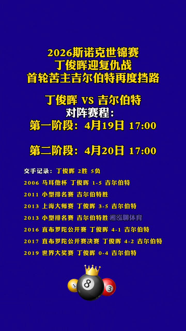 2026斯诺克世锦赛丁俊晖迎复仇战,首轮苦主吉尔伯特再度挡路。 湘泓聊体育。 丁俊晖VS吉尔伯特对阵赛程:第一阶段:4月19日17:00;第二阶段:4月20日17:00。交手记录:丁俊晖2胜5负。 2006马耳他杯丁俊晖1-5吉尔伯特;2011小型排名赛吉尔伯特胜;2013上海大师赛丁俊晖3-5吉尔伯特;2013小型排名赛吉尔伯特胜。 2016直布罗陀公开赛丁俊晖4-1吉尔伯特;2017直布罗陀公开赛决赛丁俊晖4-2吉尔伯特;2019世界大奖赛丁俊晖0-4吉尔伯特。