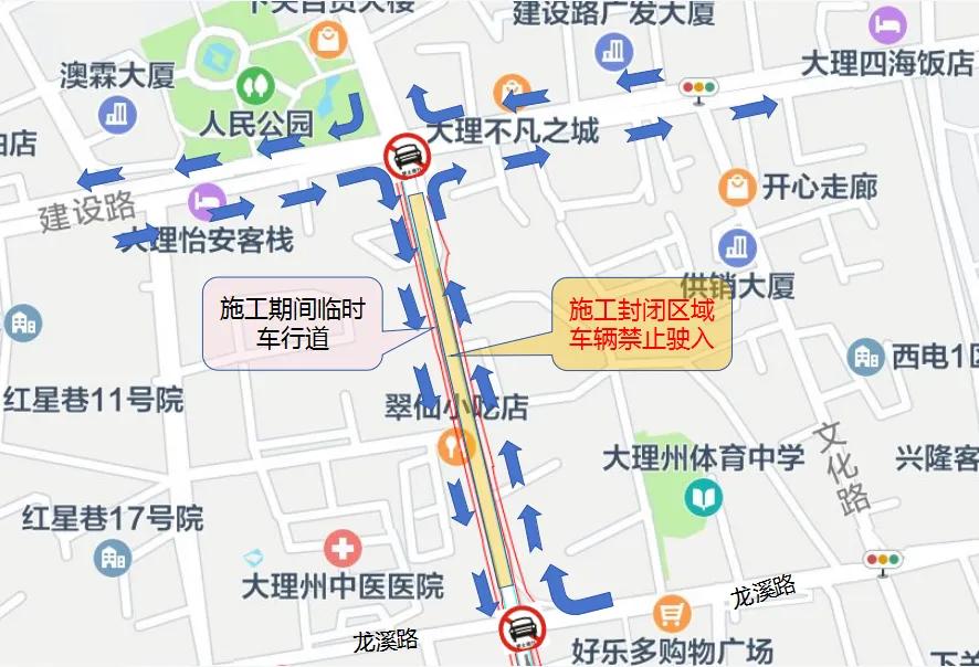 大理人民南路道路施工期间大理州人民医院(云南省滇西中心医院)主院区就诊温馨提示[心][心][心] 尊敬的市民、患者及家属:近日,大理州人民医院(云南省滇西中心医院)主院区周边的人民南路,因市政排水防涝设施提升改造,正进行分段封闭施工。 第一阶段施工时间为4月15日至7月10日,施工路段为人民南路(建设路至龙溪路段)车行道;第二阶段施工时间为4月16日至7月10日,施工路段为人民南路(福文路至南涧路)车行道。此路段通行条件受限,易出现交通拥堵、通行缓慢等状况。 为避免大家因道路施工延误就诊,保障就医出行顺畅、安全,特作如下温馨提示: 1. 提前规划出行路线 出行前请密切关注官方发布的道路施工、交通管制信息,提前规划最佳就医路线,尽量避开人民南路施工拥堵路段,选择周边可绕行道路前往医院,合理预留充足的出行时间,切勿因道路拥堵耽误就诊。 人民南路(建设路至龙溪路段)封闭期间出行方式 → 人民南路(福文路至南涧路段)封闭期间出行方式 → 大理人民医院 人民医院东门 医院 施工